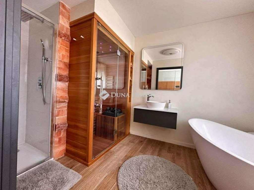 Az ingatlan rendkívül átgondolt belsőépítészeti elrendezéssel rendelkezik, igényes, prémium minőségű burkolatokkal és elegáns megjelenéssel.
