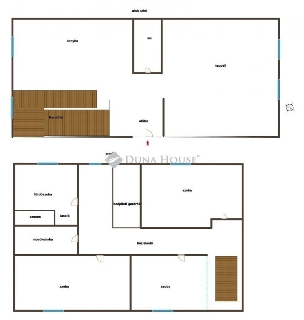 Az alsó szinten amerikai konyhás nappali, vendégmosdó, lépcsőtér és előtér található.