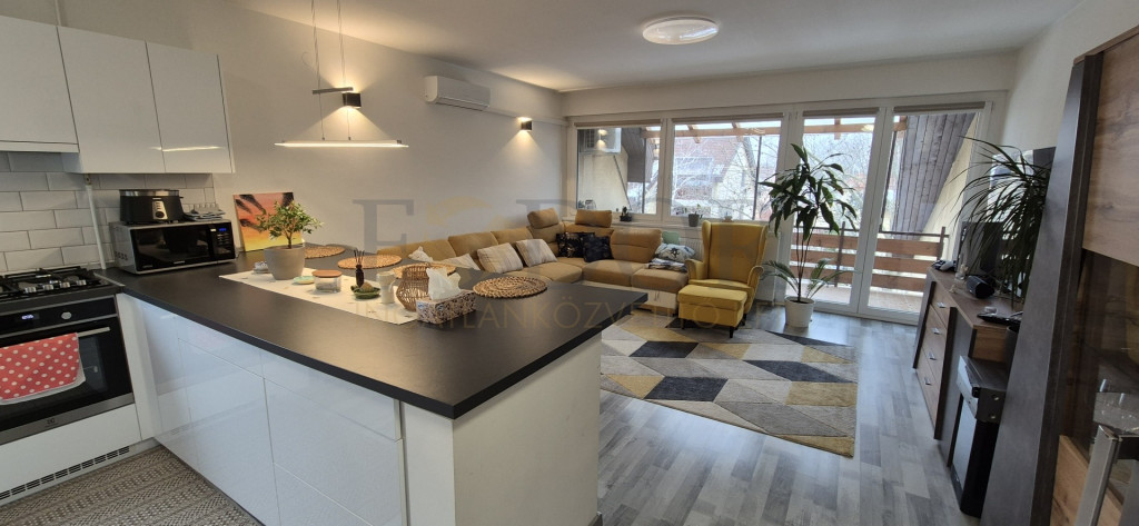 előszoba–közlekedő, amerikai konyhás nappali, 2 külön nyíló hálószoba, fürdőszoba, külön mellékhelyiség, erkély. A minőségi, gépesített konyhabútor (egyedi elszívóval) a vételár részét képezi, további bútorok megegyezés tárgyát képezik.