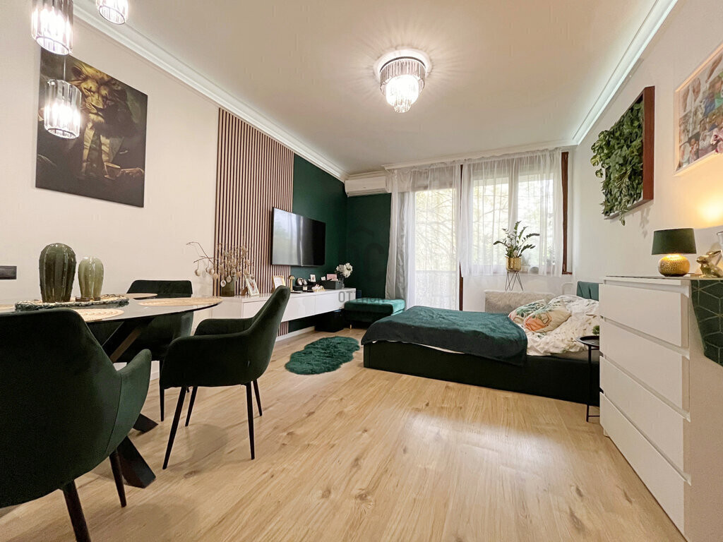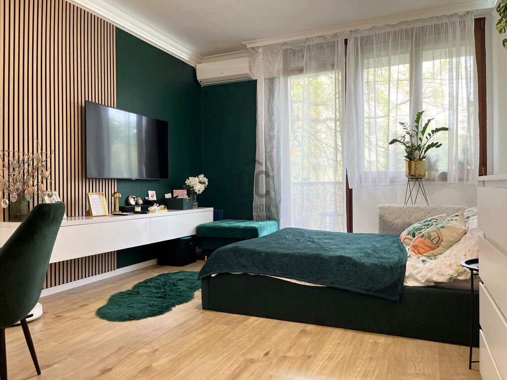 A belső tér kialakításánál a funkcionalitás és az esztétika tökéletes egyensúlya valósult meg. A zöld színű kiegészítők és a fa felületek természetközeli, nyugodt hangulatot teremtenek, miközben elegáns és fiatalos karaktert adnak az otthonnak.
