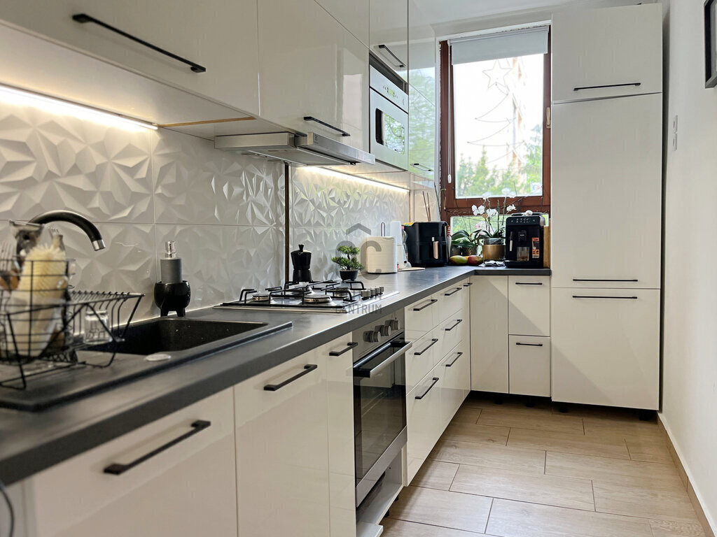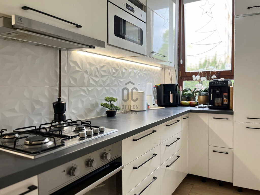 A különálló, ablakos KONYHA praktikus kialakítású, amely lehetővé teszi a természetes szellőztetést. A konyhabútor letisztult, fehér. A konyha teljesen felszerelt: főzőlap, beépített sütő, beépített hűtőszekrény, felső szekrénybe integrált mikrohullámú sütő, valamint teleszkópos páraelszívó is rendelkezésre áll.