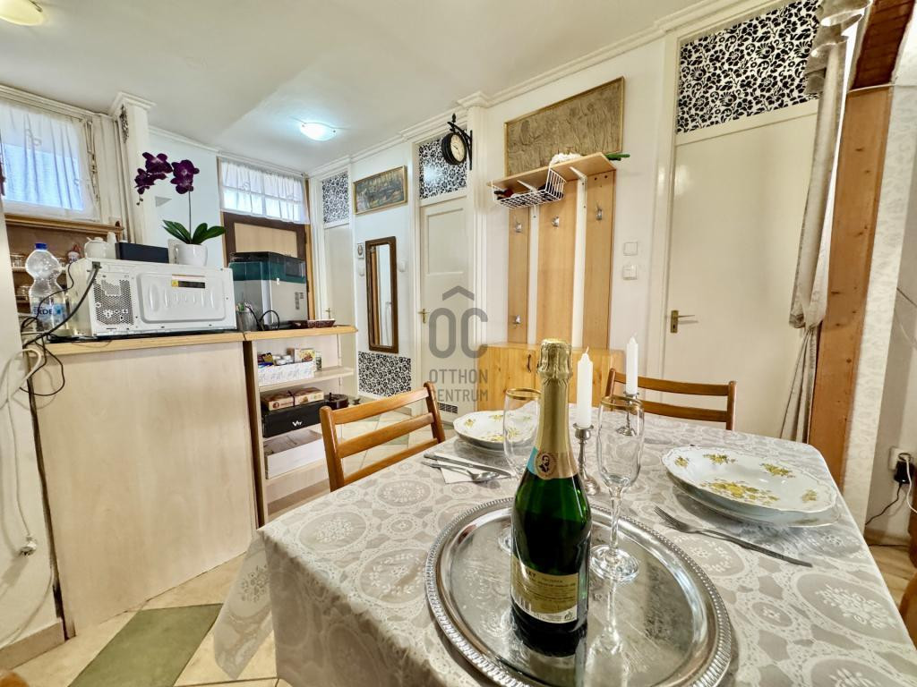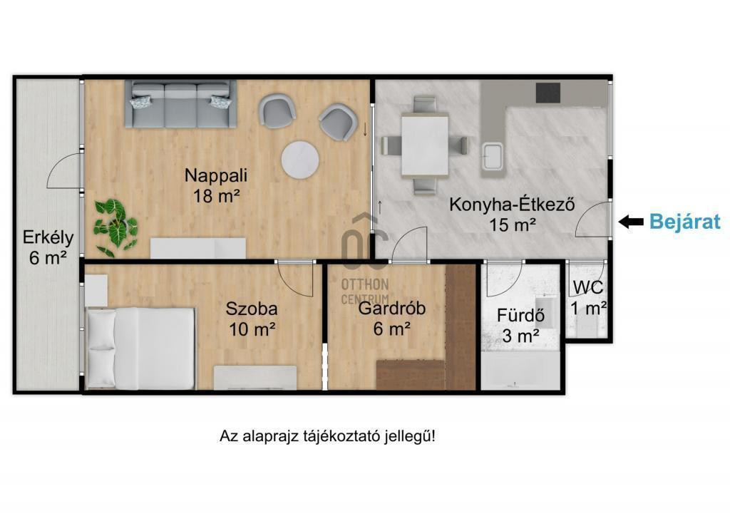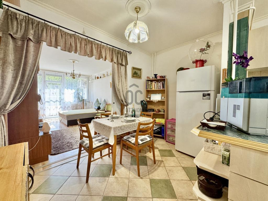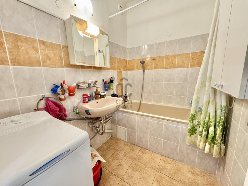 A belső elrendezés igazán élhető: világos, ablakos konyha étkezővel, nappali, hálószoba és gardrób. A nappali és étkező rész egy tolóajtóval teljesen el is különíthető – így rugalmasan használható a tér, attól függően, mire van szükséged: közösségi élettérre vagy külön nyugalomra. A lakásban található fürdőszoba és külön WC, ami kényelmesebbé teszi a mindennapokat.