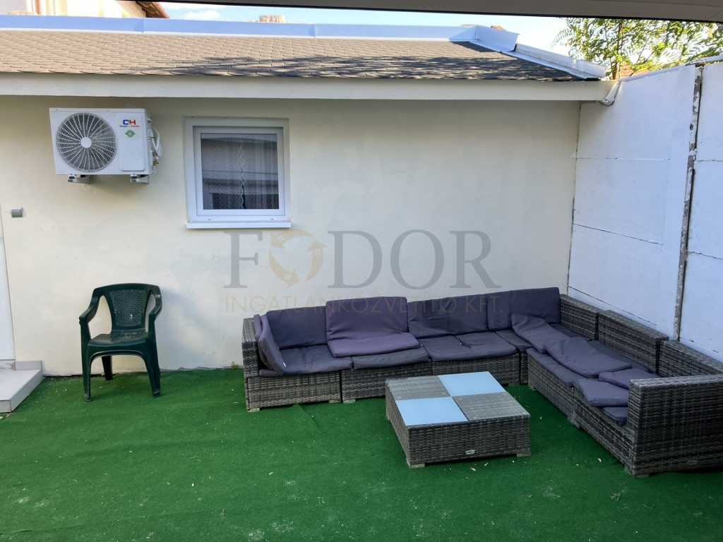 A 30 m²-es kert parkosított, hangulatos kiülővel rendelkezik, és a hátsó telekhatárnál található egy különálló, teljes körűen felújított melléképület, amely önálló szobaként funkcionálhat — akár dolgozószobának, vendégszobának vagy hobbiszobának is ideális.