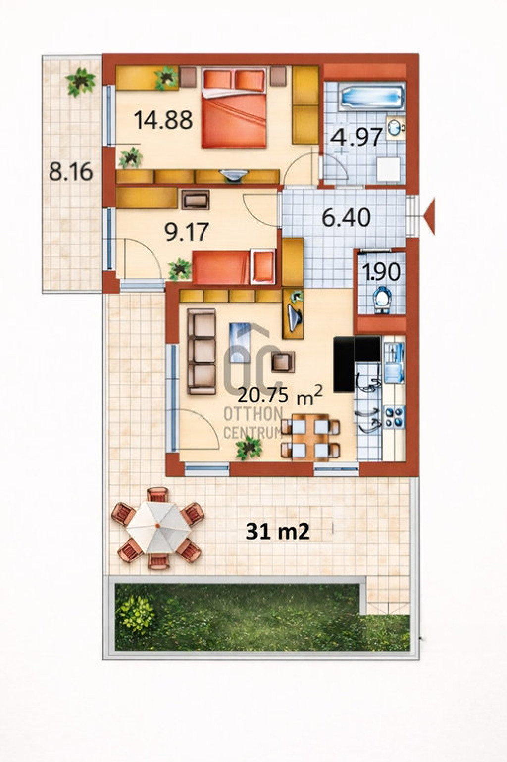 - egy 8 m2-es, ill. egy 31 m2-es terasz, kertkapcsolattal
