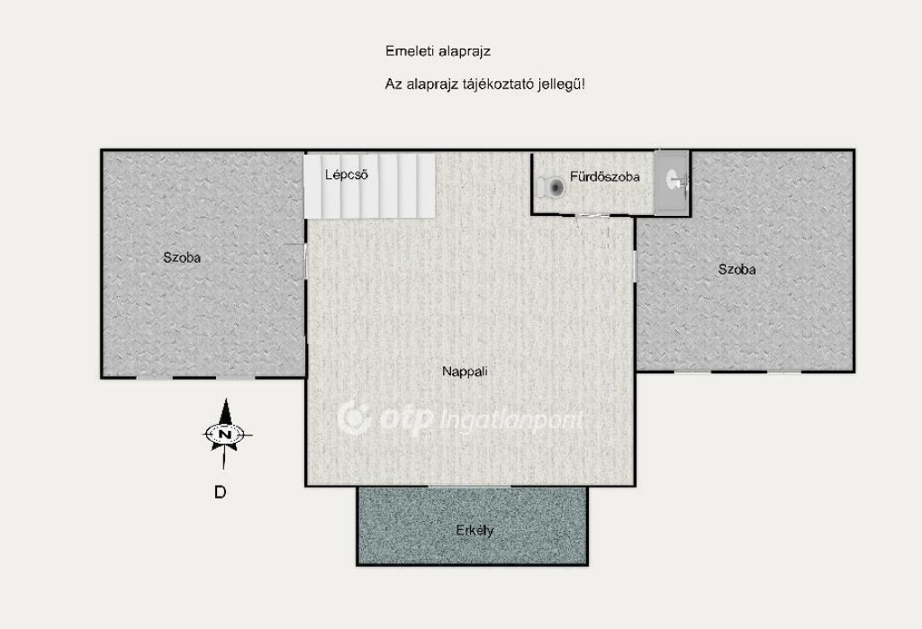 A felső szint központja a nappali, ahonnan egy erkély nyílik kovácsoltvas korláttal. Az erkély burkolata cserére szorul, de a hangulata így is különleges. A nappaliból két különálló szoba nyílik, amelyeket gyerekszobának, dolgozószobának vagy vendégszobának is alkalmasak . Fent található a harmadik fürdőszoba is, zuhanyzóval és WC-vel.