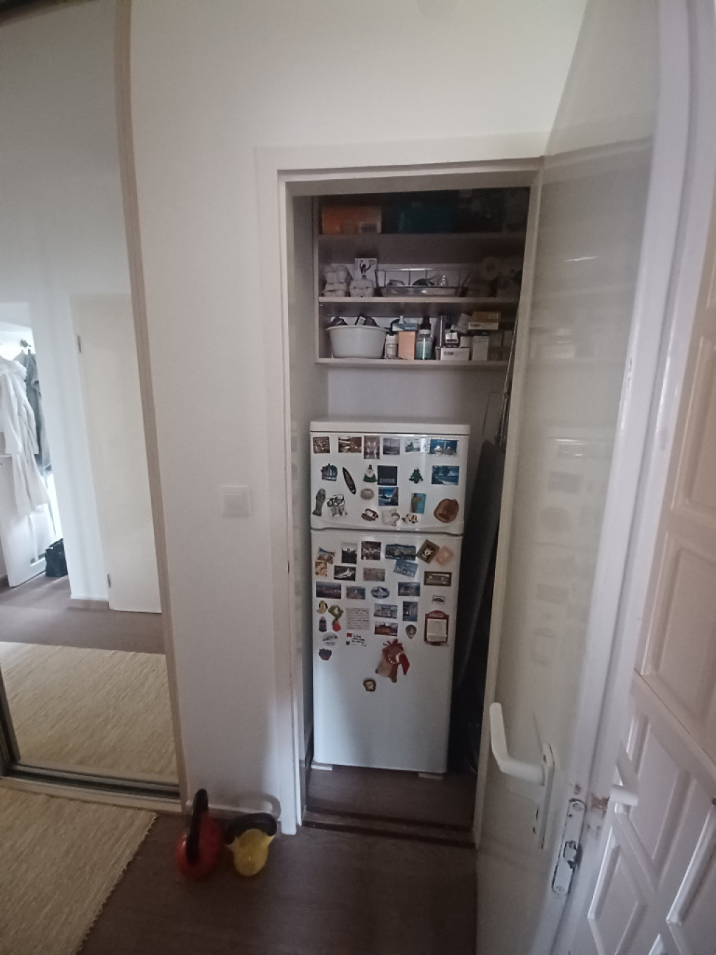 A WC külön helyiségben helyezkedik el, és a kamra is hozzájárul a kényelmes élethez. Az előszobában kapott helyett a hatalmas tükrös gardrób szekrény, melyet tolóajtókkal oldottak meg,melyek optikailag is sokat nagyítanak a helyiségen.