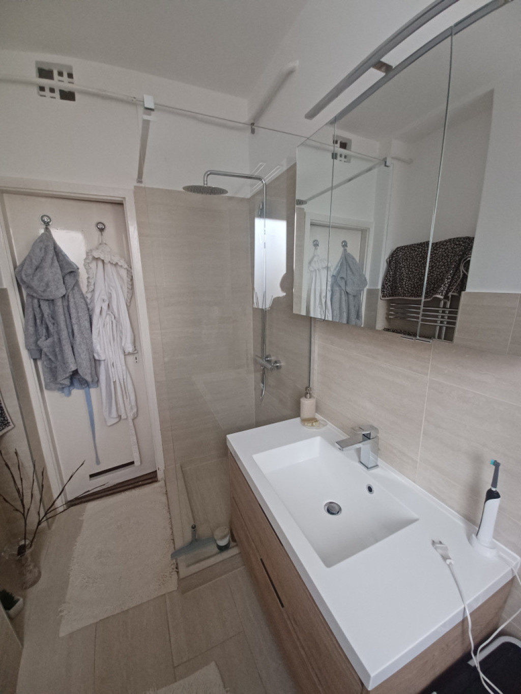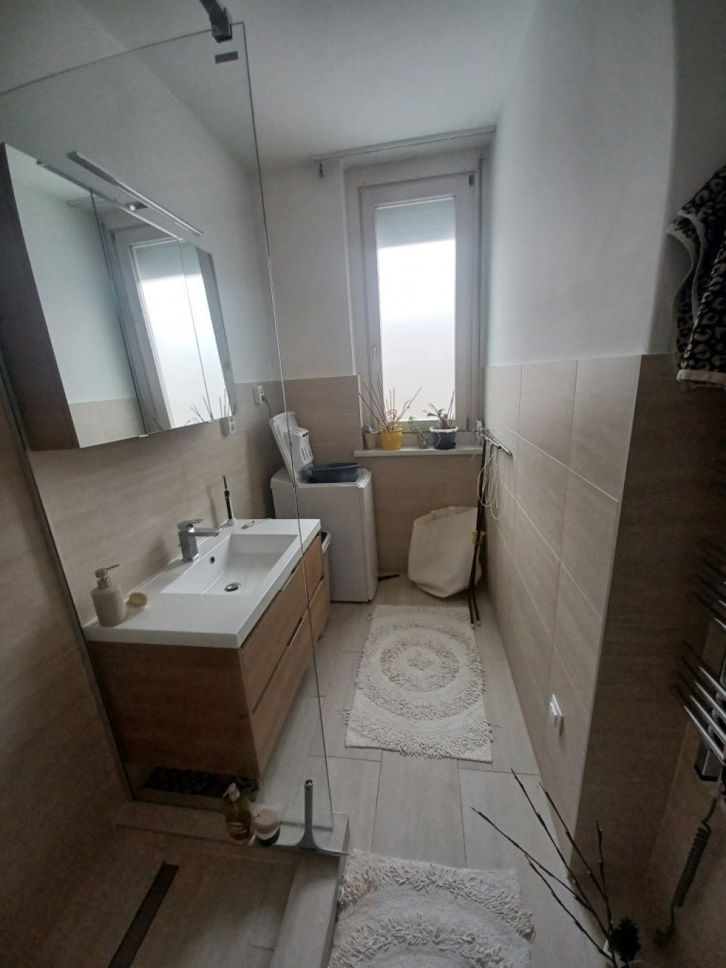A konyha funkcionálisan letisztult. A fürdőszoba felújítása alkalmával ügyeltek az anyagválasztásra, fontos szempont volt a magas színvonal, kényelem és az összhang.A lakótelepi fürdőszobáknál átlagosan nagyobb a fürdőszoba.