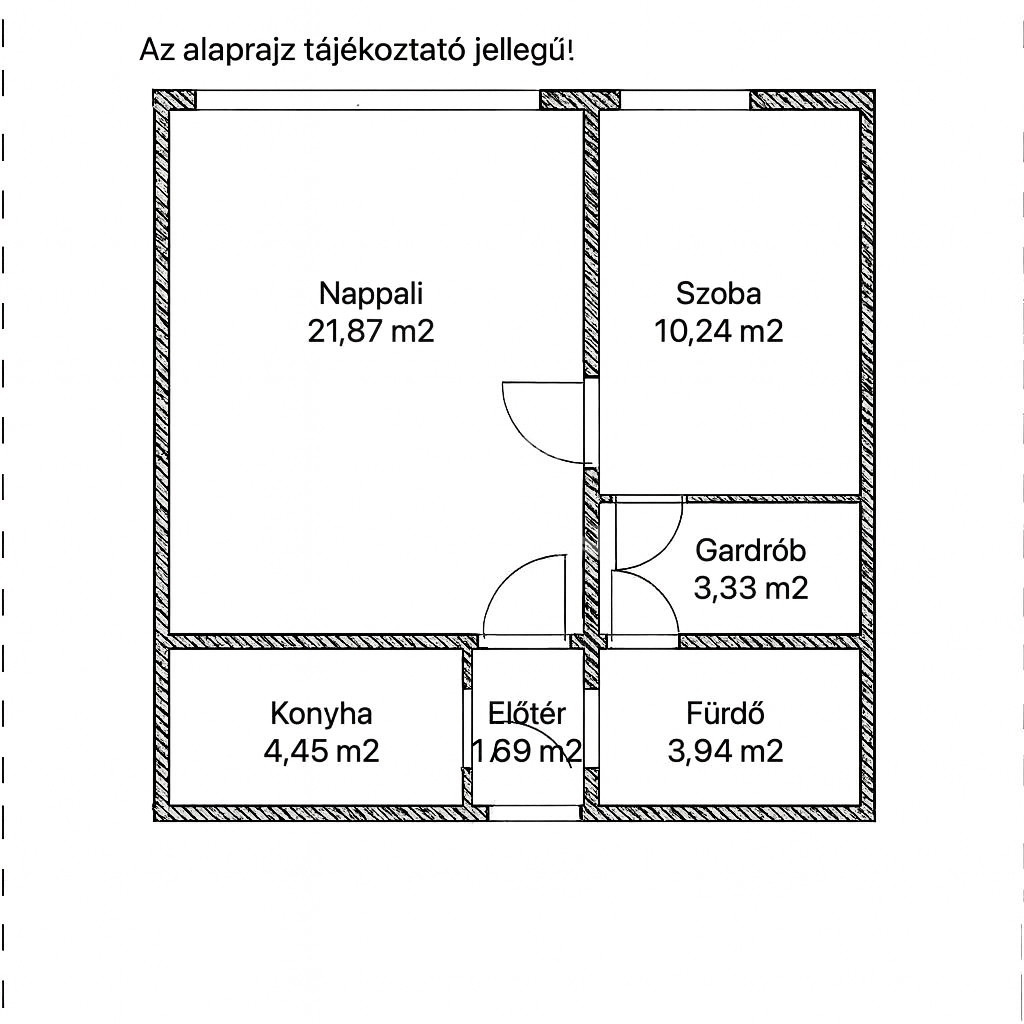 előszoba(1,69m2), konyha(4,45m2), nappali(21,87m2), szoba(10,24m2), gardróbszoba(3,33m2), fürdőszoba+WC(3,94m2)