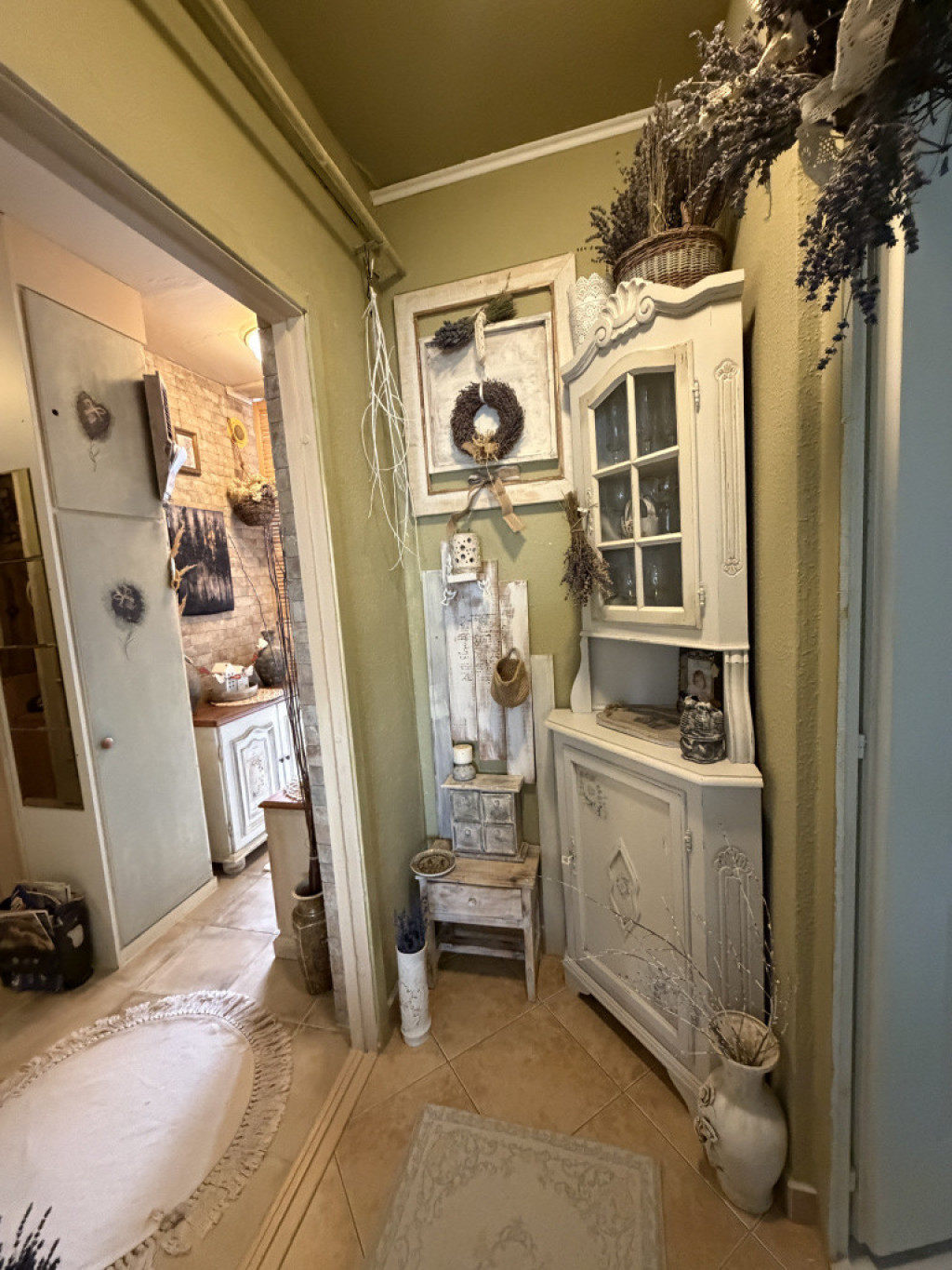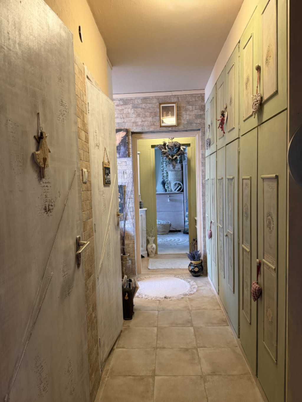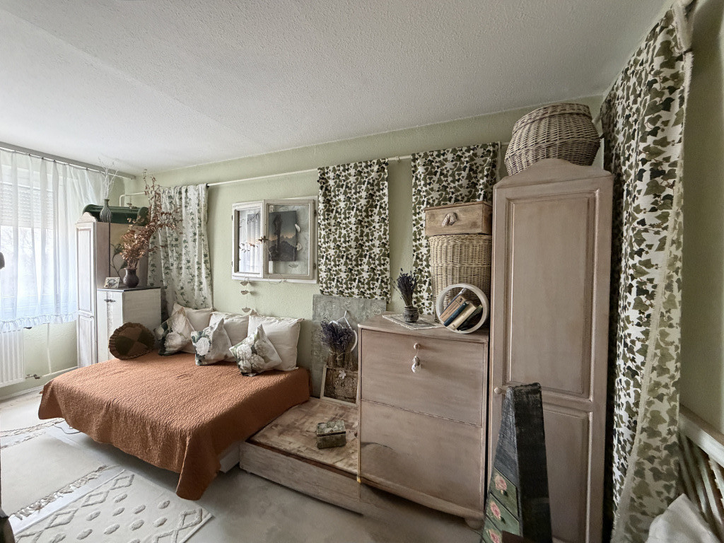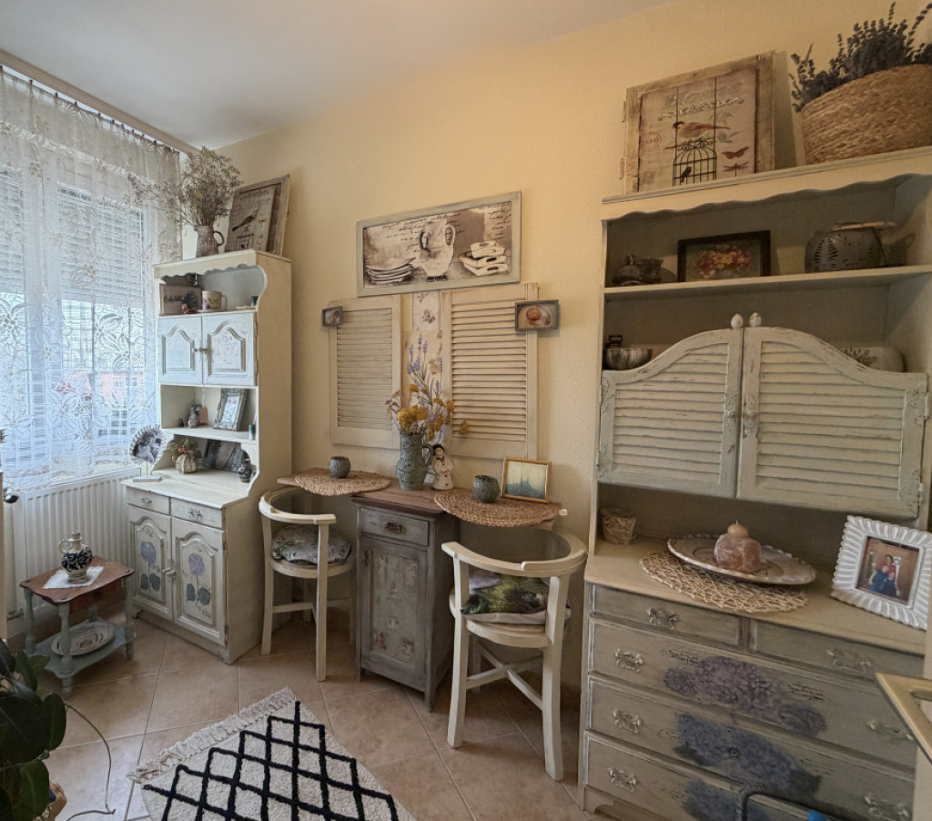 A lakás nagyon szép, világos, kellemes hangulatú, egyedi kézzel festett bútorokkal berendezett.