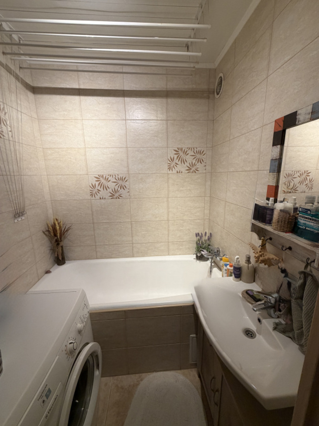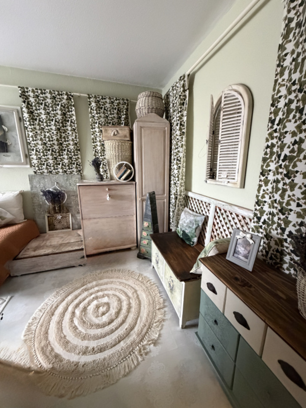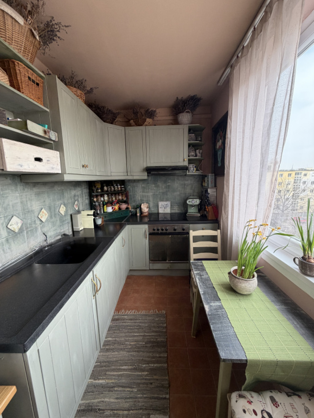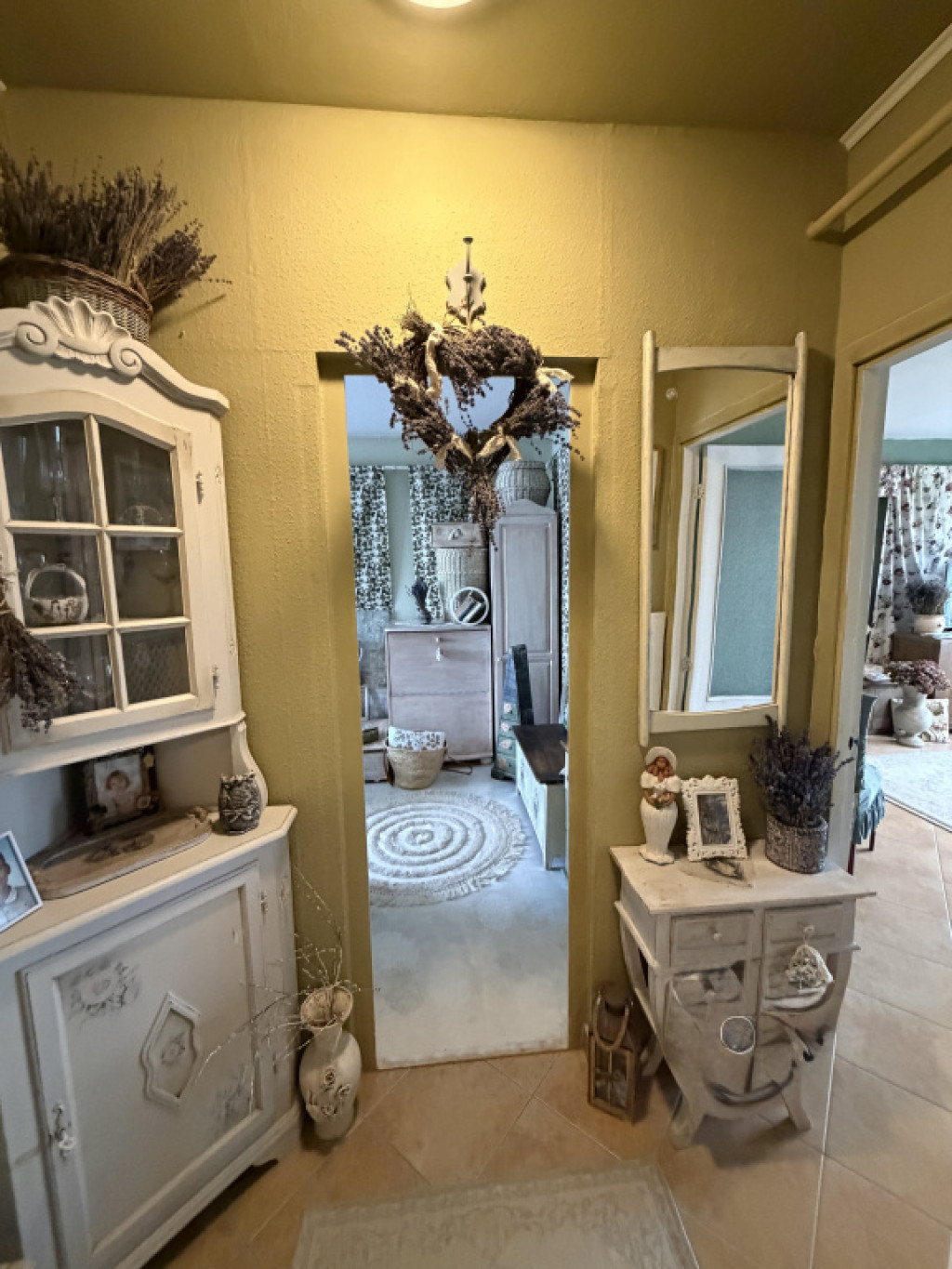 A lakás nagyon szép, világos, kellemes hangulatú, egyedi kézzel festett bútorokkal berendezett.