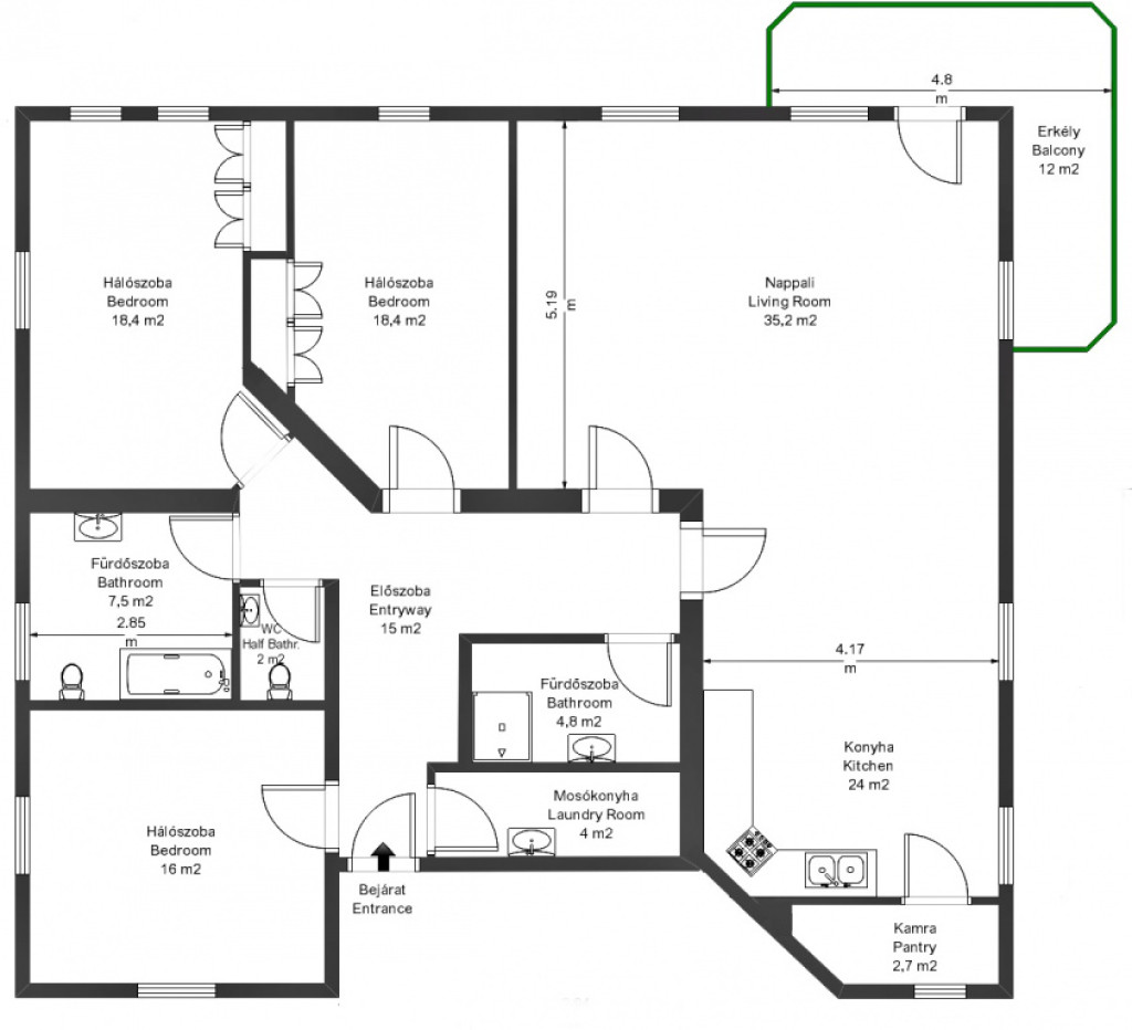 • 2 fürdőszoba (egy kádas WC-vel, egy zuhanyzós), valamint külön vendég-WC