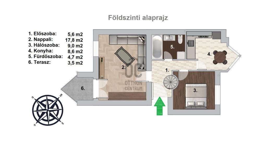 - A nappali délkeleti, a hálószoba és a konyha északnyugati tájolású.