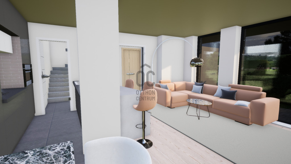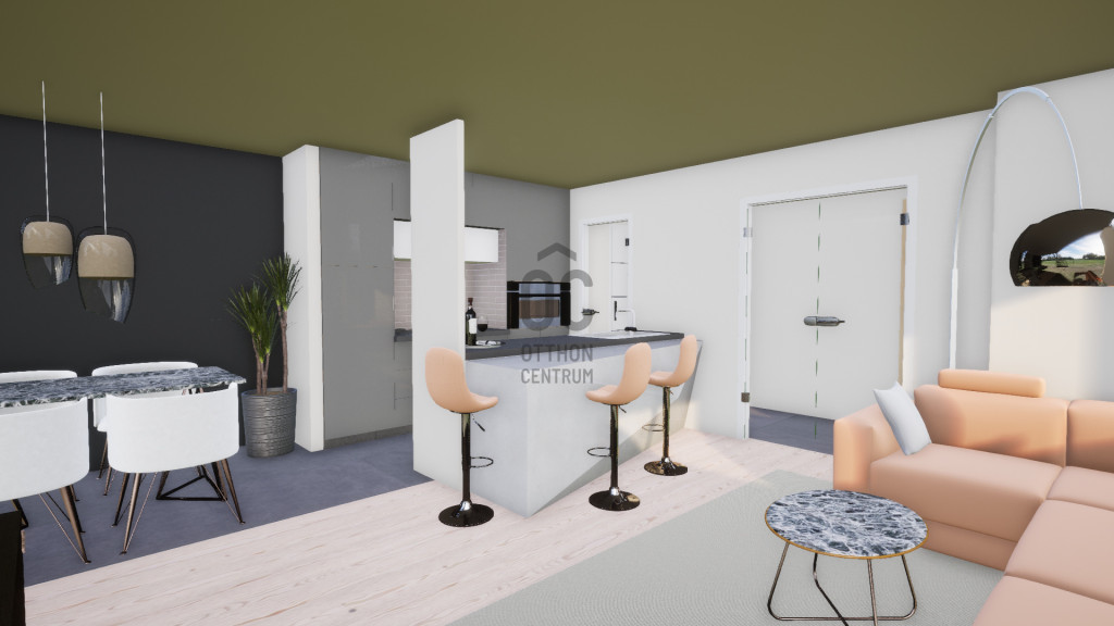 terasz kapcsolódik, mind az étkező-konyhából, mind a nappaliból önálló kijutási lehetőséget biztosítottunk a teraszra.