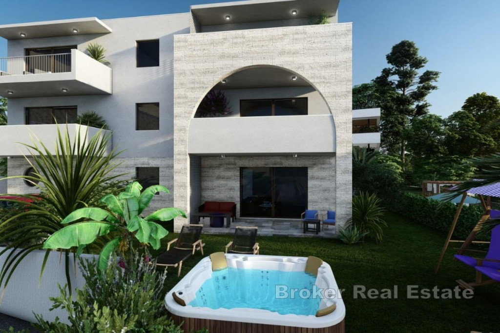 This elegant and modern new building is located on Čiovo, in an exceptionally attractive location, very close to the sea. The spacious and bright apartment is situated on the northern side of the island, just 50 meters from beautiful sandy beaches, charming restaurants, and convenient shops. The apartment consists of a 59 m² of living space,functional kitchen with dining area, a spacious living room, a comfortable 1 bedroom, a modern bathroom, and a generous 13 m² terrace with a sea view. The building has three floors and offers a luxurious shared swimming pool. High-quality materials are used in construction and finishing, including elegant tiles, premium sanitary ware, electric shutters, and air-conditioned rooms. A garage parking space is available for purchase separately at a price of €20,000. This beautiful apartment is the perfect choice for anyone seeking a peaceful and idyllic location with an unforgettable sea view. BROKER REFERENCE ID:2031/212