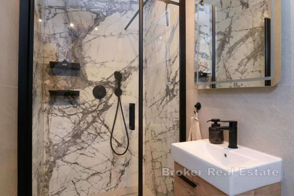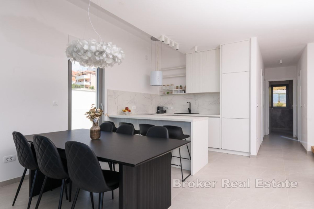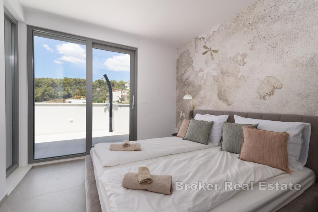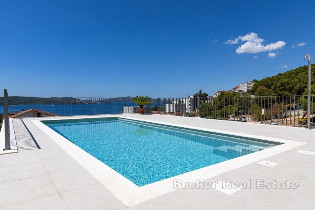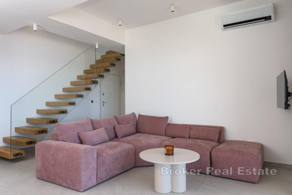 In an attractive location on Čiovo, a modern penthouse with stunning sea views is for sale. The apartment has a total living area of 107 m², a covered terrace of 21 m², and a rooftop terrace of 81 m². The living space is spread over two levels. On the first floor, there are three bedrooms, three bathrooms, and an open-concept area combining the kitchen, dining room, and living room. The living area opens onto the covered terrace. A modern interior staircase leads to the second floor, which features an additional bedroom, a bathroom, and a storage room. This floor also includes a large rooftop terrace with a pool, sunbathing area, and breathtaking panoramic views. In addition to the private pool, residents have access to a shared pool, and the price includes two underground parking spaces. The apartment has a private elevator with direct access to the unit. This penthouse is ideal as a luxurious residence, but also an extremely attractive investment for short-term rental thanks to its layout, amenities, and location. BROKER REFERENCE ID:5470/30