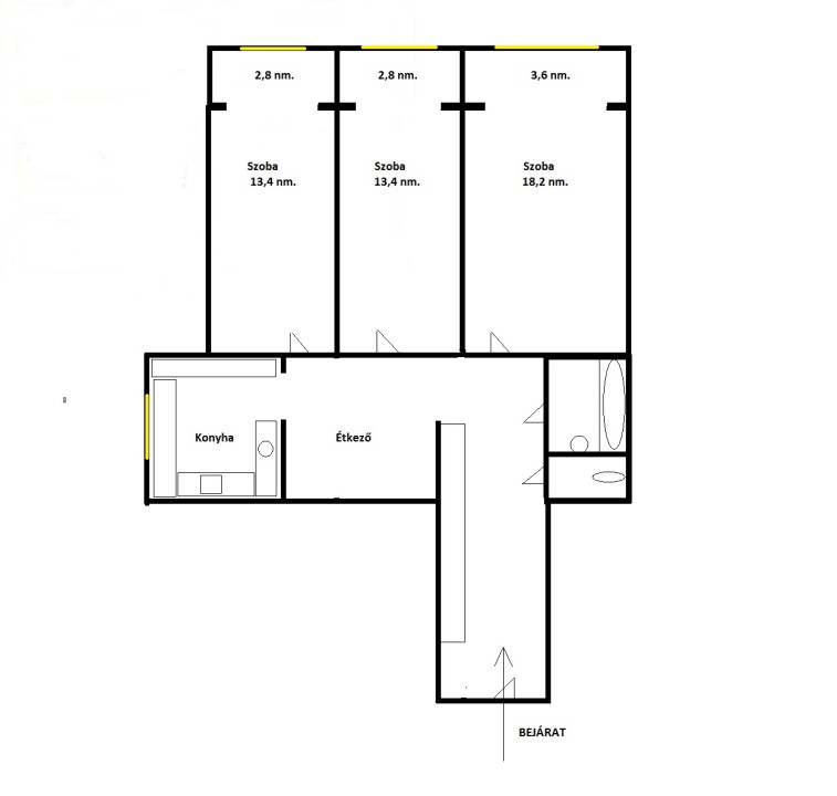 Az ingatlan tartalmaz: előszoba, modern beépített szekrényekkel, itt még a szárító gép is elfér, külön WC., kádas fürdőszoba, étkező, igényes konyha, kerámia lapos tűzhellyel, a mosogatógép helye adott, 3 db. külön nyíló szoba. Ezekhez loggia tartozott, be lettek építve ytong téglával, növelve a szobák méretét. Természetesen vissza lehet állítani az erkélyt.