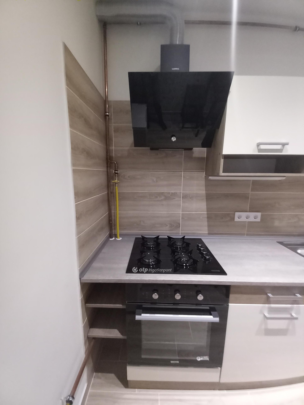 A konyhában új beépített szekrény található tűzhellyel, páraelszívóval és hűtőszekrénnyel felszerelve.
