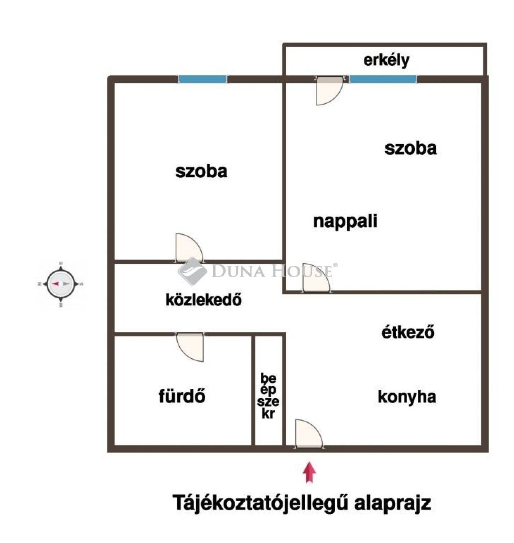 - nappali-szoba, szoba, konyha - étkező, közlekedő, előszoba, fürdőszoba- erkély (5 nm)