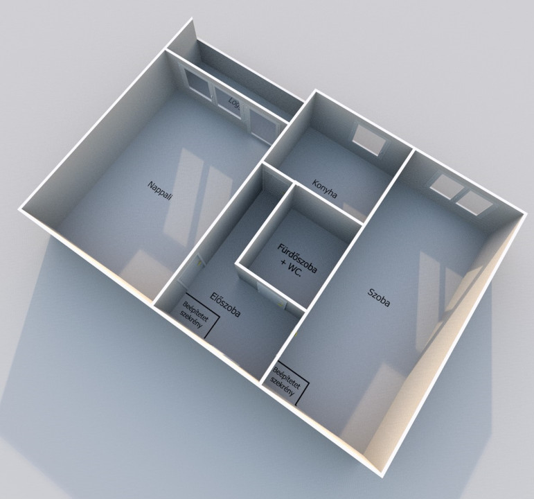 - Helyiségei: előszoba, 2 külön nyíló szoba, konyha, fürdőszoba + WC.