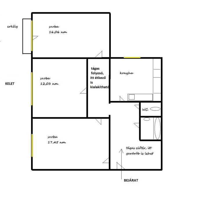 Tartalmaz: előszoba, itt beépített szekrénnyel, de akár itt is kialakítható egy étkező is, fürdőszoba, külön WC., konyha, egy folyosó szakasz, ezt is lehet használni étkezőnek, 3 db. külön nyíló szoba, az egyikből erkély nyílik, és láthatjuk a Nagy Templomot is!