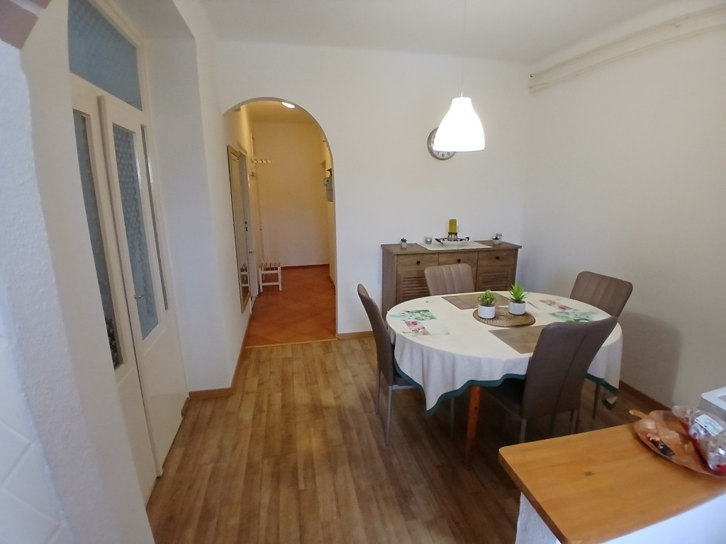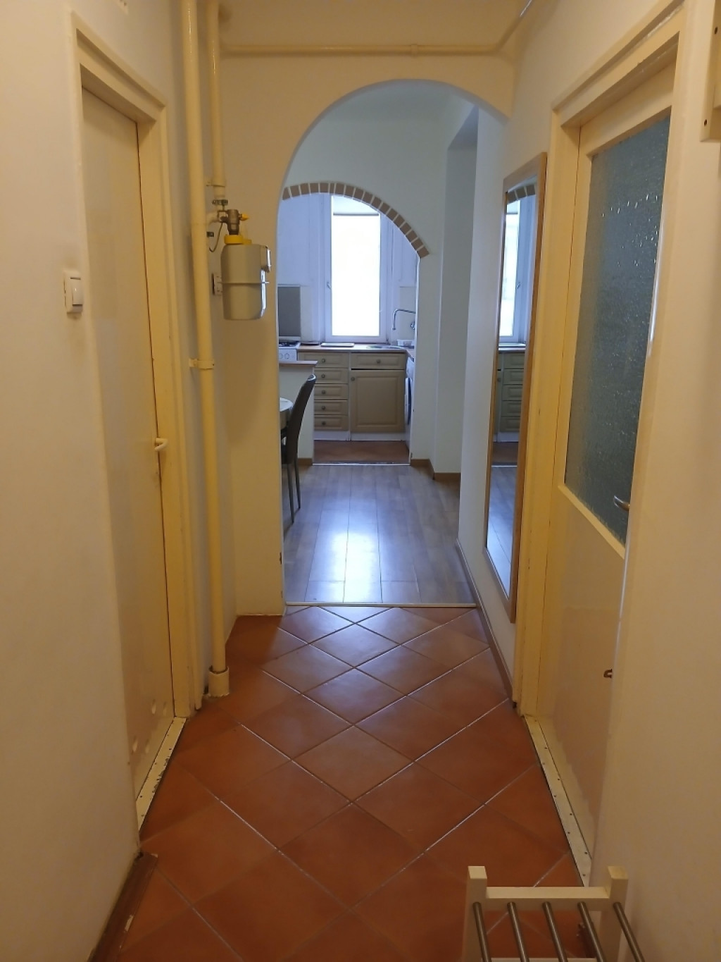 Részben felújított. A szobák külön nyílnak, nagyszoba és étkező laminált parkettával, kisebbik szoba parkettával, a többi helyiség járólappal burkolt. Fürdőszoba és wc együtt van.
