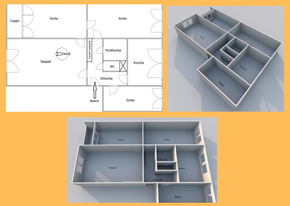 - Helyiségei: előszoba, nappali + 3 szoba, konyha, fürdőszoba, WC külön.