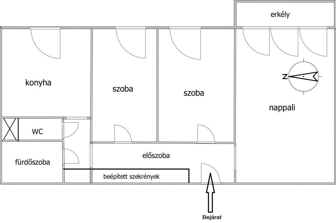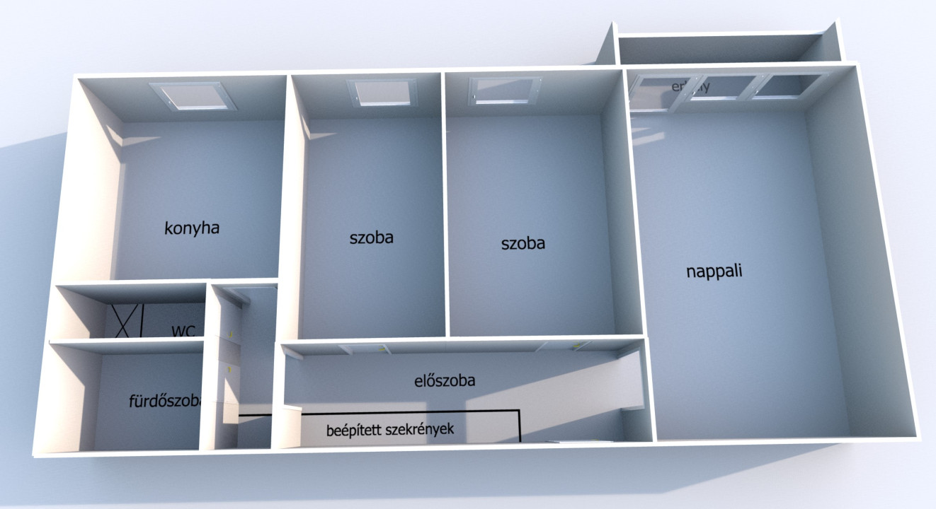 - Helyiségei: nappali, 2 külön nyíló szoba, előszoba, konyha, fürdőszoba, WC külön.