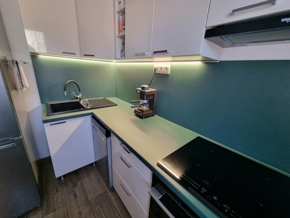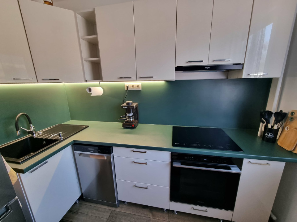 -új modern konyhabútor, elektromos kerámia lapos főzőlappal, elszívóval, víz tisztító berendezéssel, mosogató géppel