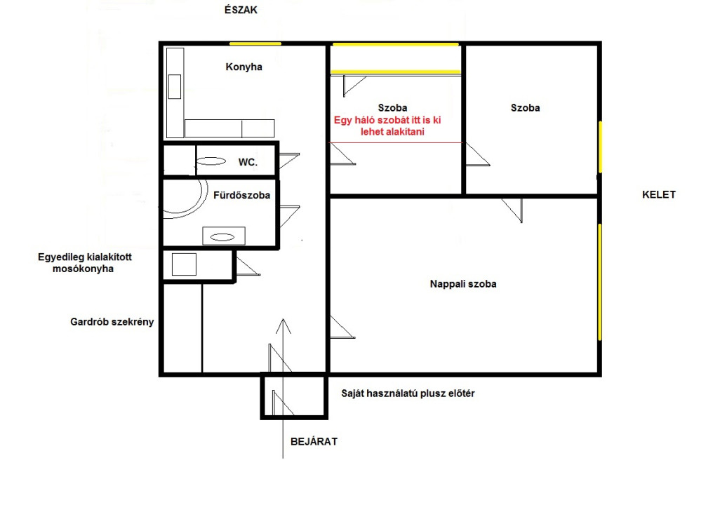 A hőszigetelt műanyag nyílászárós lakás tartalmaz: kis előtér, nagy előszoba, 2+1 szoba, kis szobából erkéllyel, fürdőszoba, külön WC., konyha.