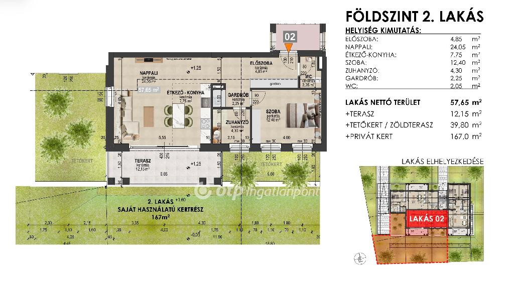 - Lakás 57,65 m2 + 12,15 m2 terasz + 39,8 m2 tetőkert
