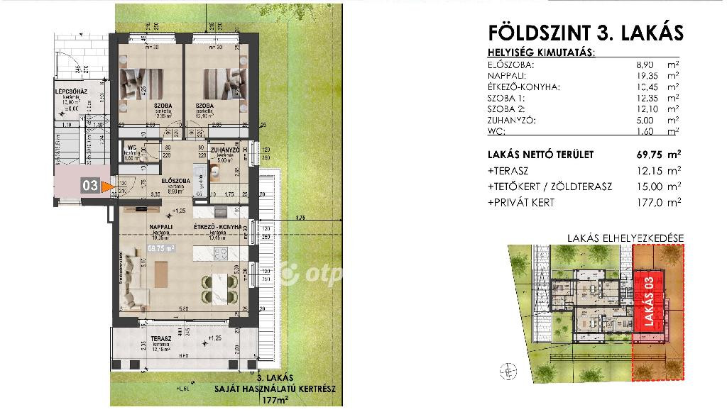 - Lakás 69,35 m2 + 12,15 m2 terasz + 15 m2 tetőkert