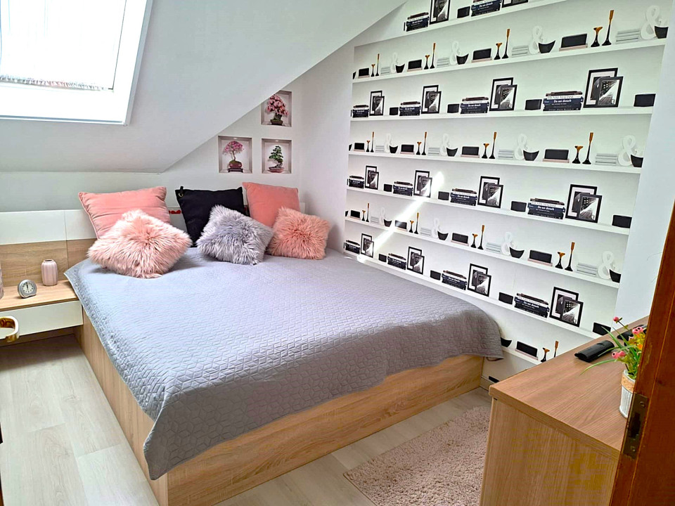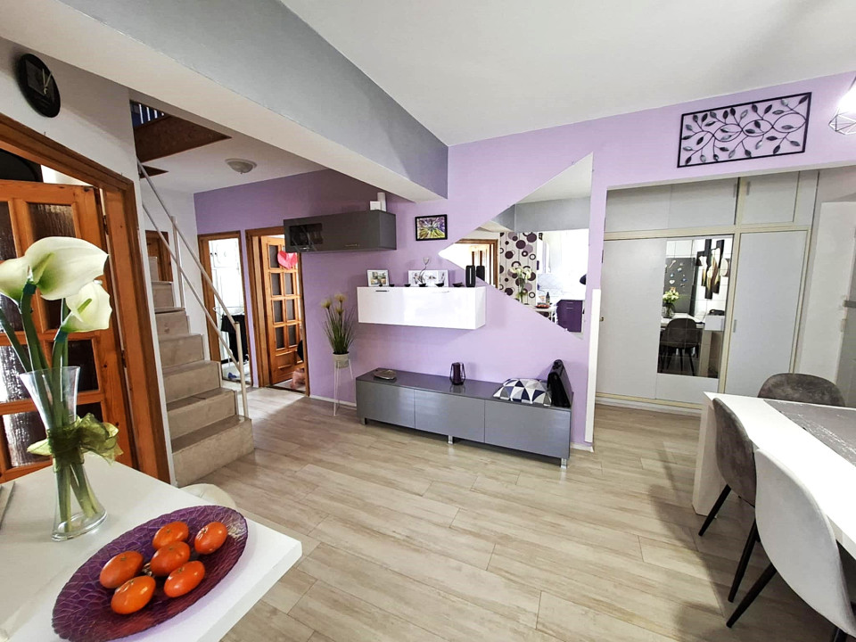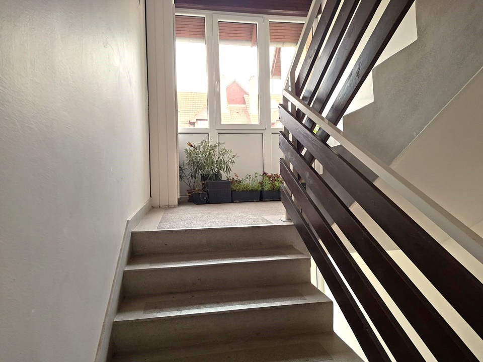 -Belső két szintes lakásként az elosztása optimális és kényelmes. Az alsó szint, nappali+2 hálószobából, nagy és világos étkező konyhából, fürdőszobából, kamrából és egy mosókonyhából áll, a nappaliból pedig egy 4 m2-es erkély nyílik.