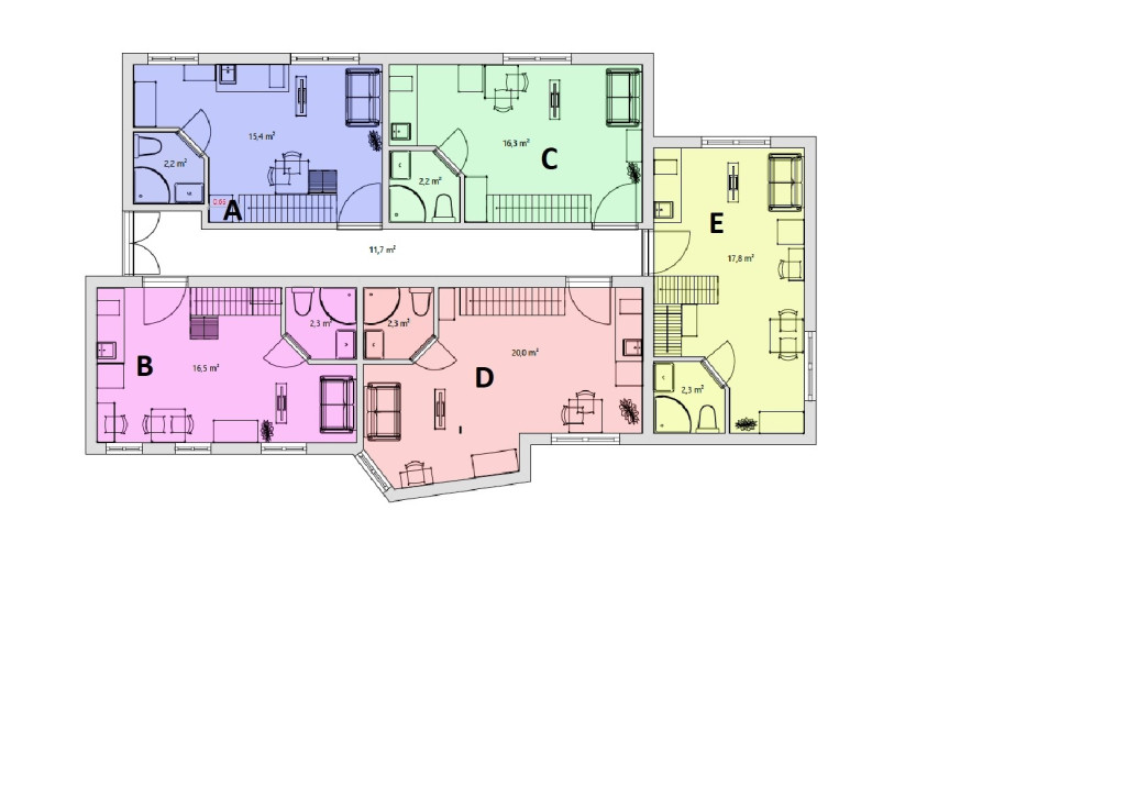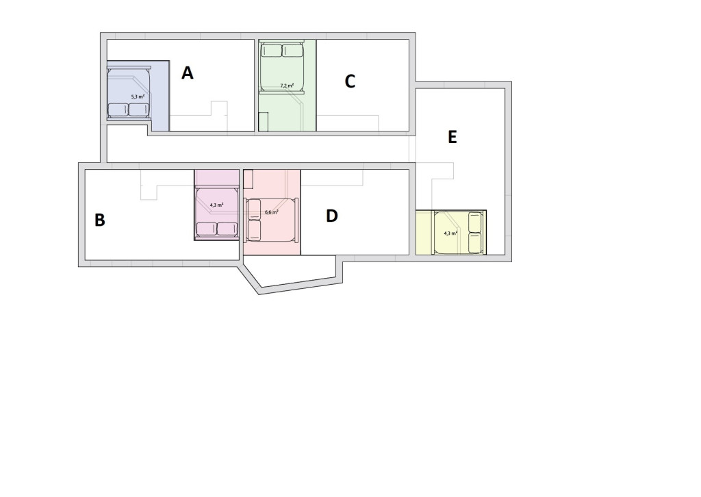 Alaprajzon az A -B - C - D -E lakások megjelölve: