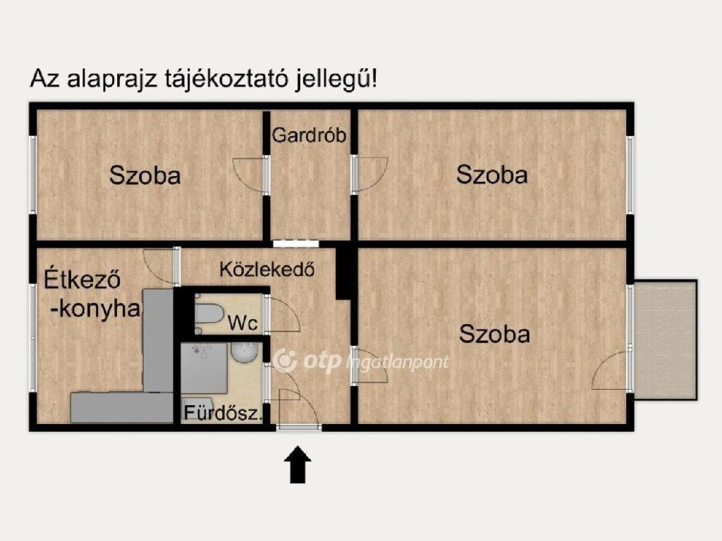 Közlekedő (6,8 m2), 3 külön bejáratú szoba (18,1 m2, 13,4 m2 és 11,2 m2), Gardrób (4,2 m2), Étkező-konyha (9,7 m2), Zuhanyzós fürdőszoba (2,6 m2), Wc (0,9 m2).