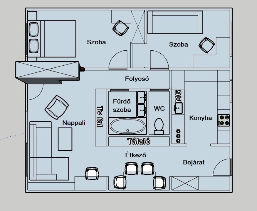 • Elrendezés: nappali + 2 külön nyíló szoba