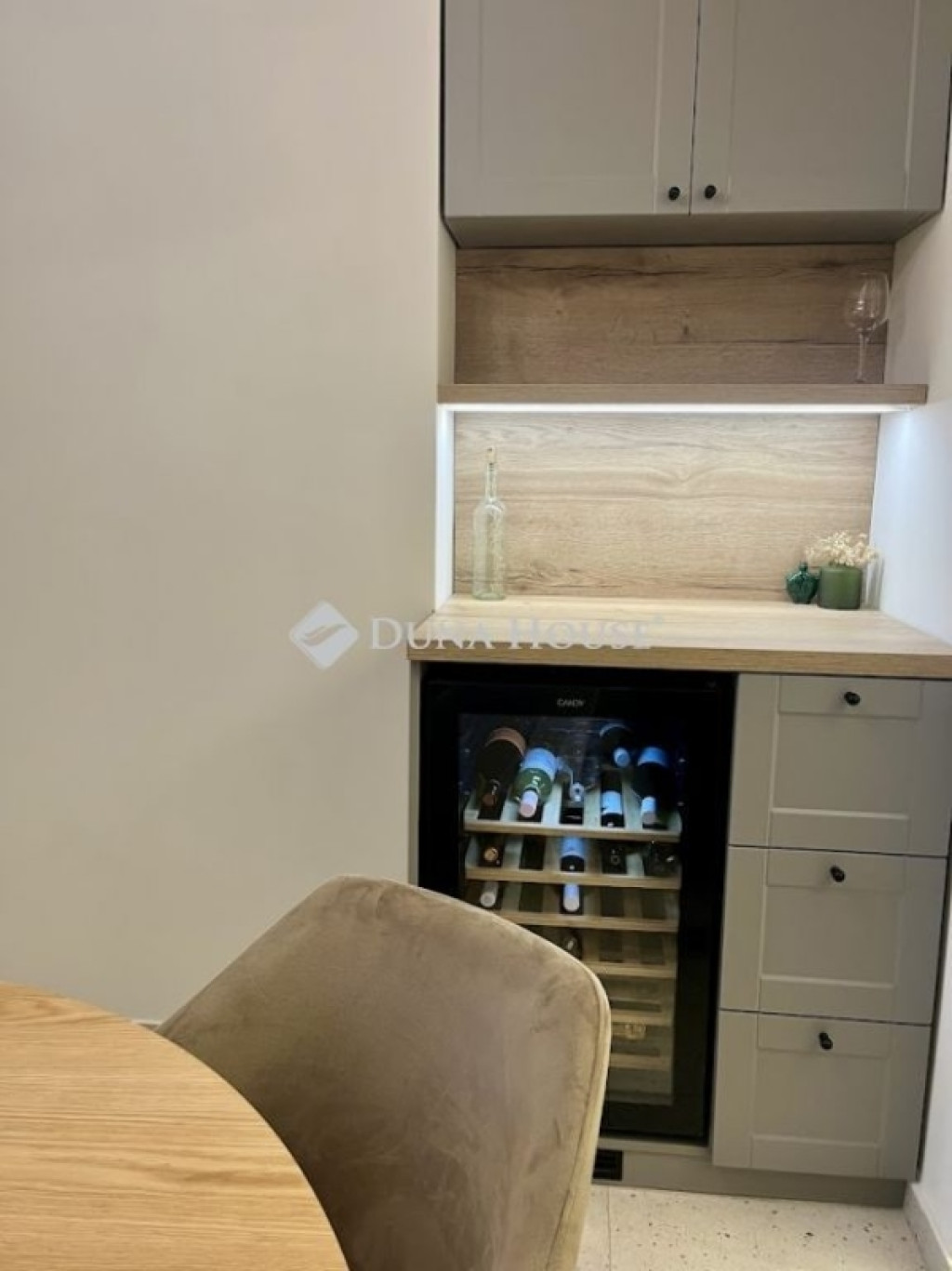 - az étkezőben egyedi borhűtő-körbeépítés, praktikus tárolófelületekkel