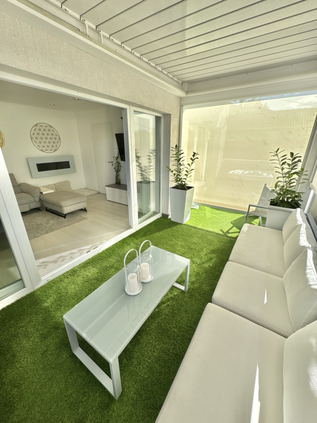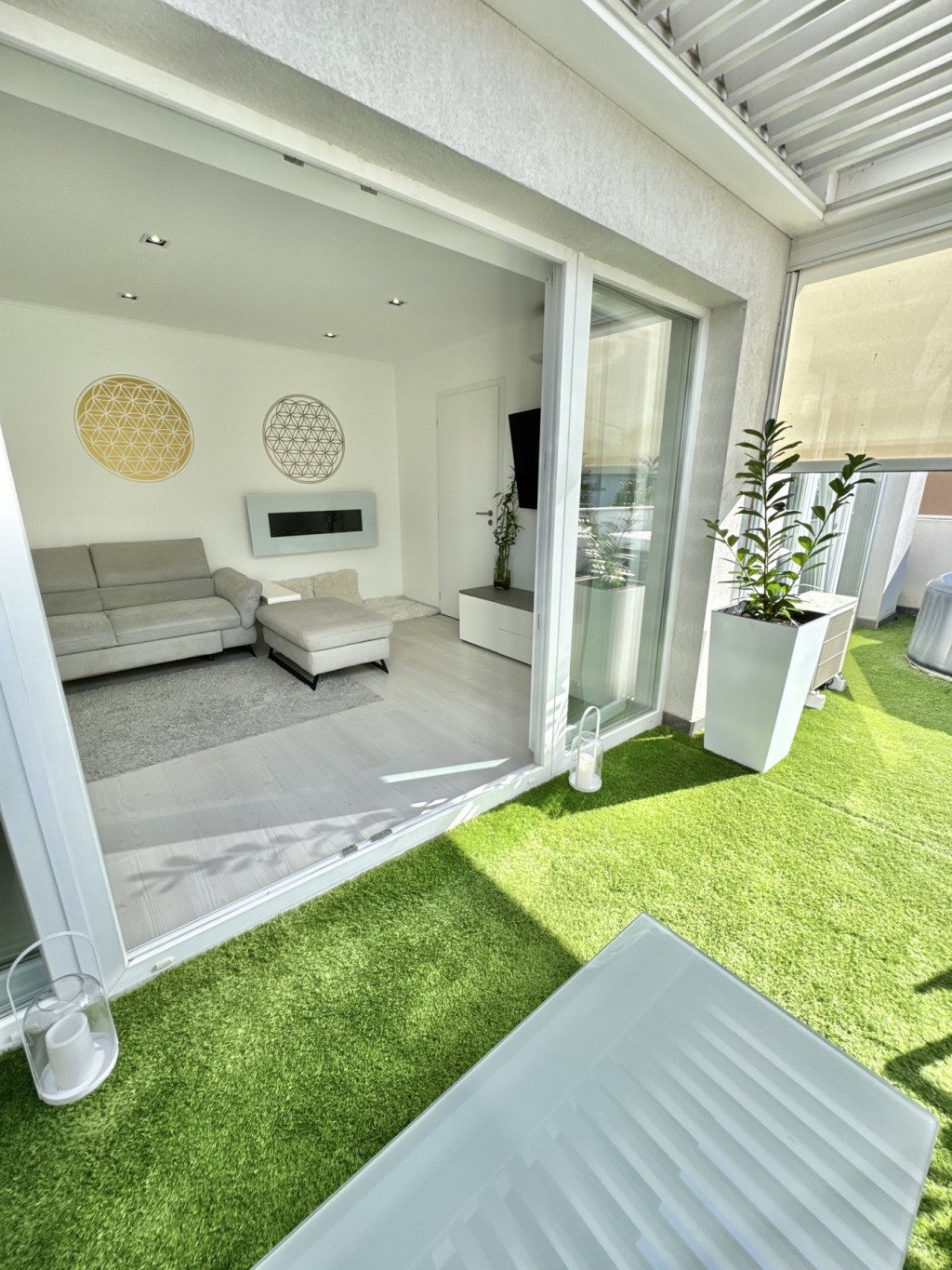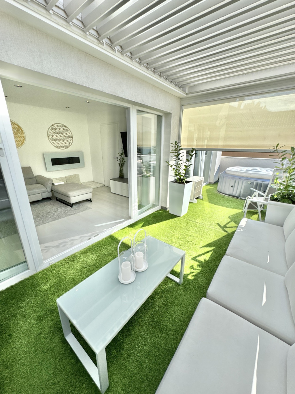 A hatalmas méretű teraszon a virágok és kerti bútor szett mellett kényelmesen elfér a jakuzzi is. A teraszon elektromos sötétítő rendszer lett kiépítve hangulatvilágítással (ennek ára 10 millió Ft újonnan).