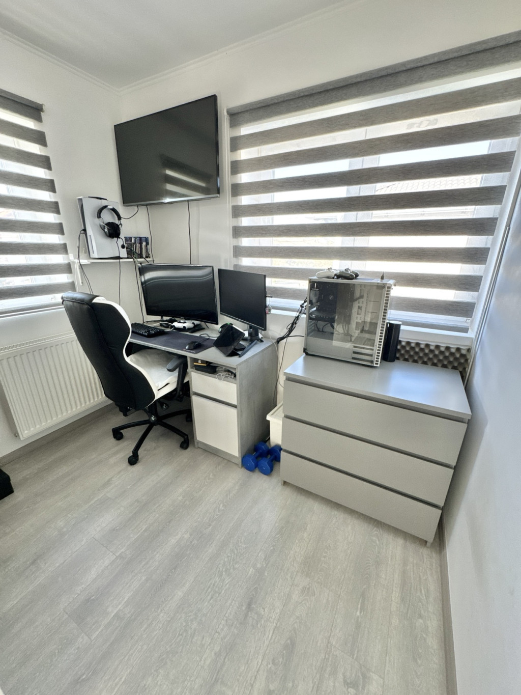 A nyílászáró műanyag bukó-nyíló, hőszigetelt, 3 légkamrás thermo üvegezéssel, lap függönyök (fényáteresztő + sötétítő is). Riasztóval ellátott.