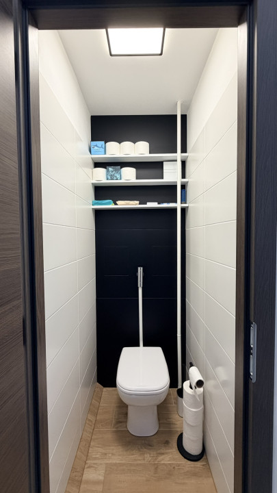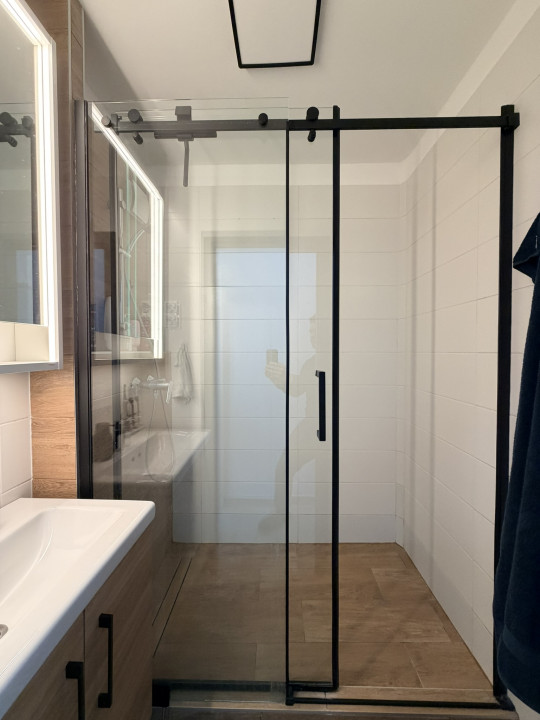 A fürdőszobában a régi csövek és vízvezetékek cserélve lettek, a zuhany épített tolóajtós elrendezéssel lett kialakítva, továbbá a hely növelése érdekében a mosogép kiállás a kamrába lett áthelyezve.