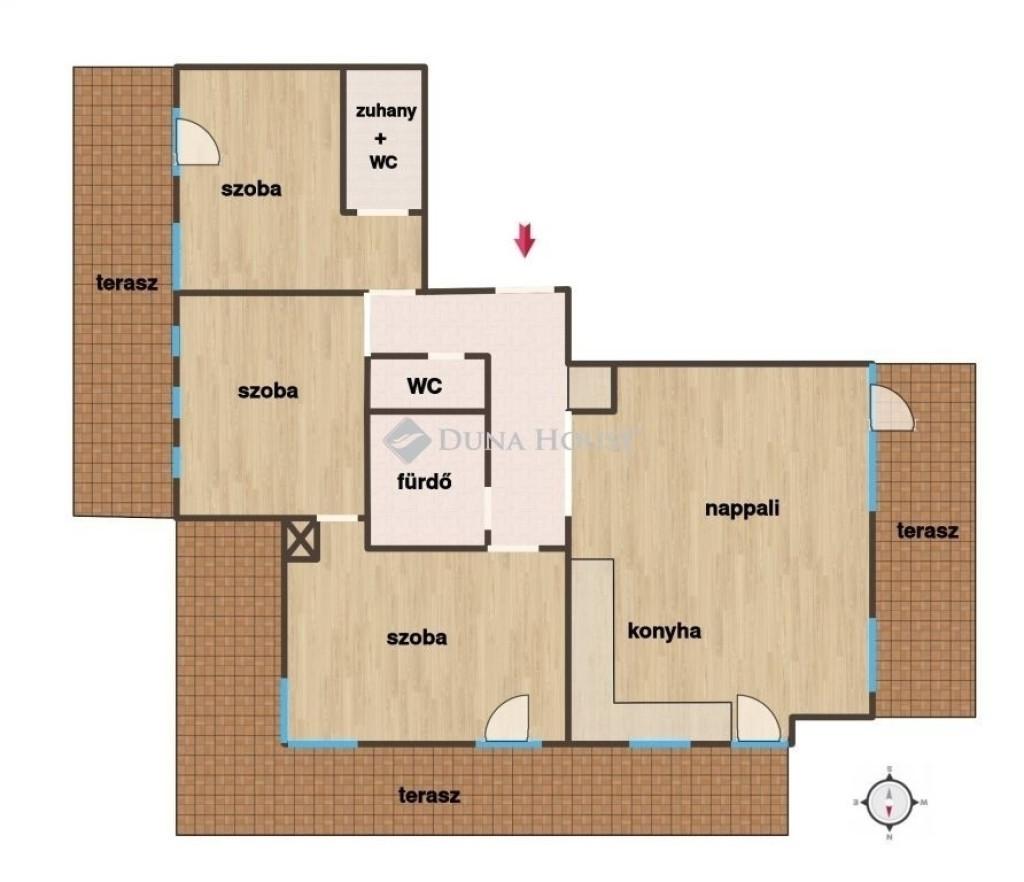 A nappali amerikai konyhás kialakítású, rendkívül világos és tágas tér, amely nyugati tájolású teraszkapcsolattal rendelkezik. A lakás különlegessége, hogy mindhárom hálószobából közvetlenül ki lehet lépni egy-egy saját teraszra így összesen 40 m² erkélyfelület áll rendelkezésre.