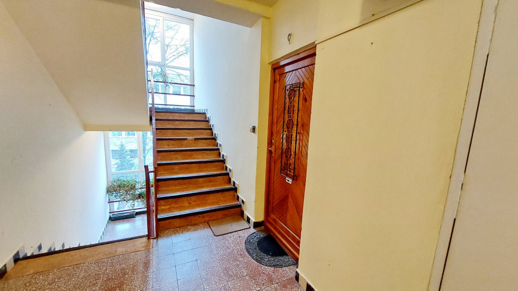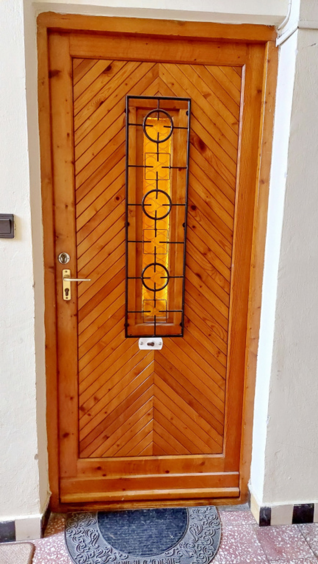 - Original wooden entrance door with security bar lock