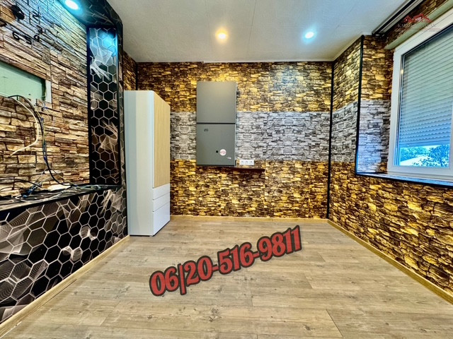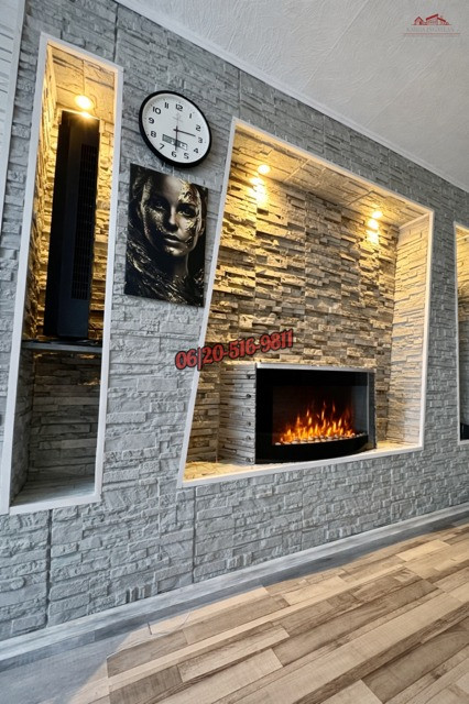 A teljes lakás gipszkarton előtétfallal rendelkezik, ezt burkolták le részint díszkővel, részint műanyag dekor panelekkel, egy igazán különleges, fiatalos hangulatot adva az ingatlannak. Minden szobába egyedi, osztott világítás van kialakítva, külön hangulat világítás funkcióval, bujtatott radiátorok, a nagyobbik szobában légfűtő funkcióval ellátott elektromos kandalló is található. A felújítás során nem csak a fiatalos kialakítás, hanem a praktikum is fontos volt a tulajdonosnak, ez mindenhol érezhető.