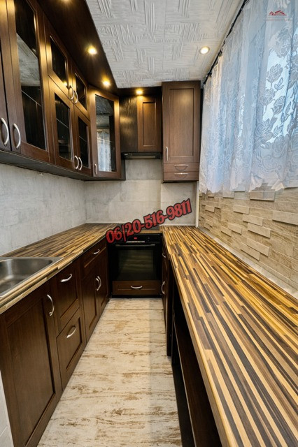 A szobák, az előszoba és a konyha laminált parketta, a többi helység járólapos burkolattal rendelkezik. A nagyobbik szobából nyílik egy tágas erkély, ahonnan a városra van kilátásunk.
