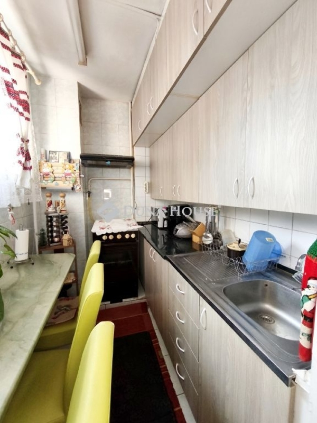 Ami fontos, hogy a konyha ablaka nem belső légudvarra néz, hanem utcafronti, így a helyiség világos, természetes fénnyel teli.
