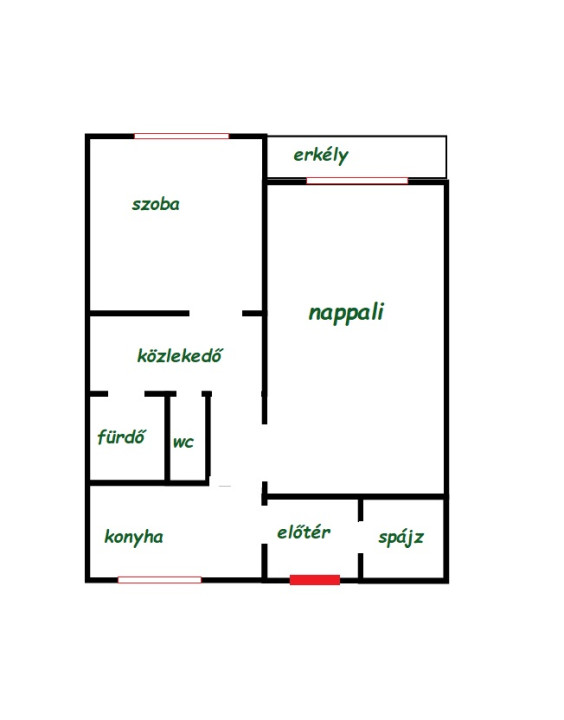 - Elrendezés: nappali + 1 szoba, külön konyha, fürdő, WC, kamra