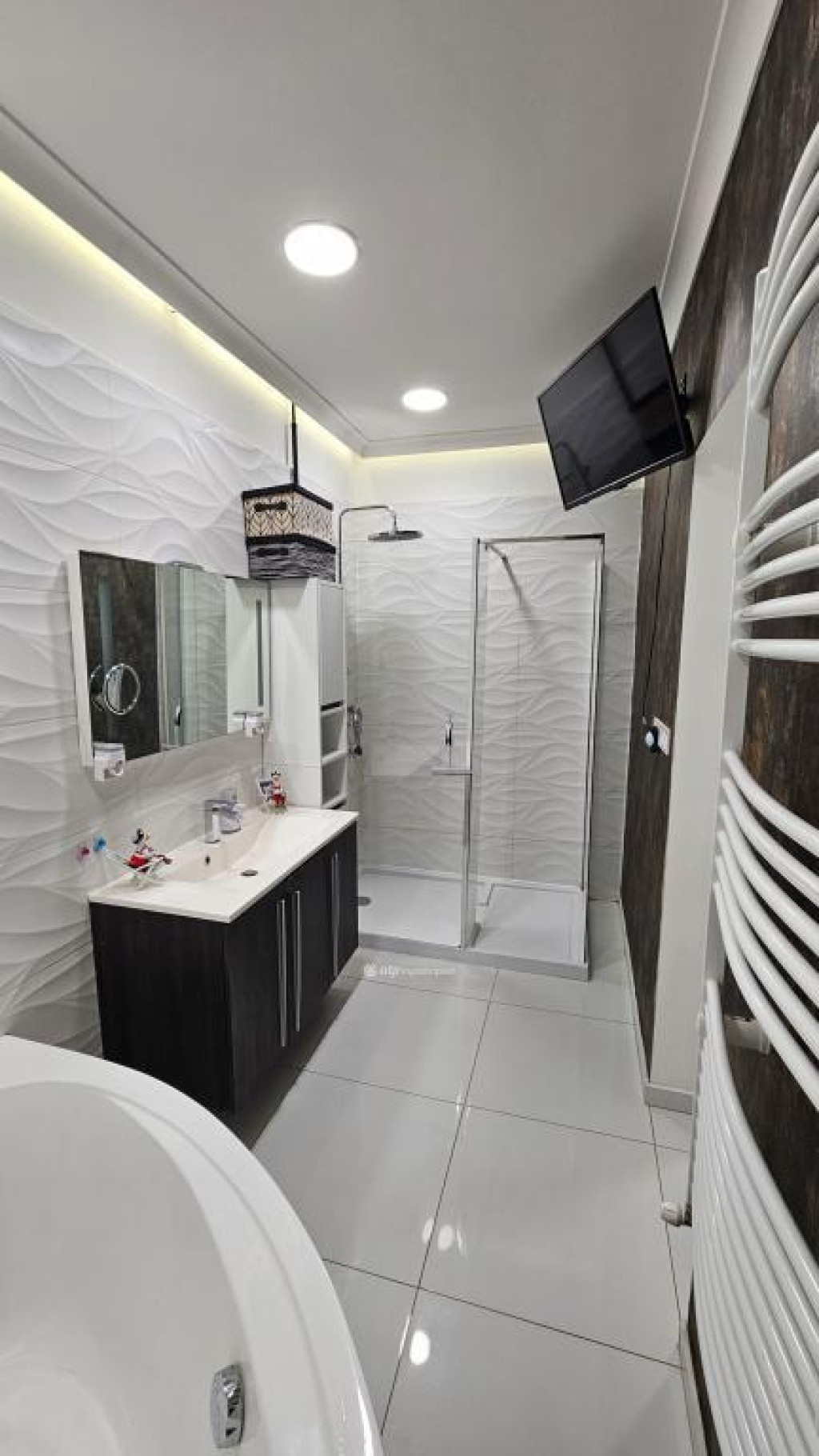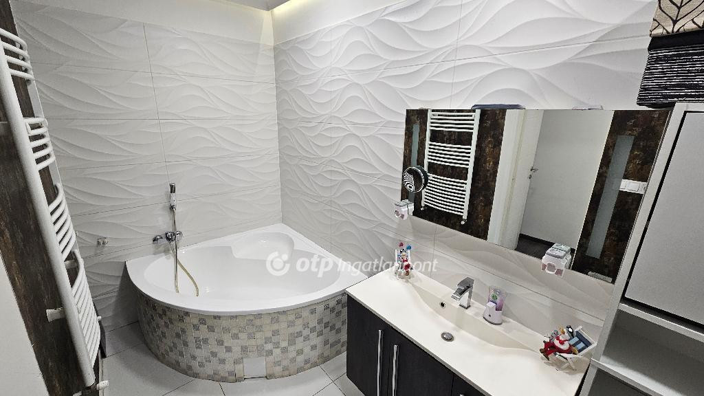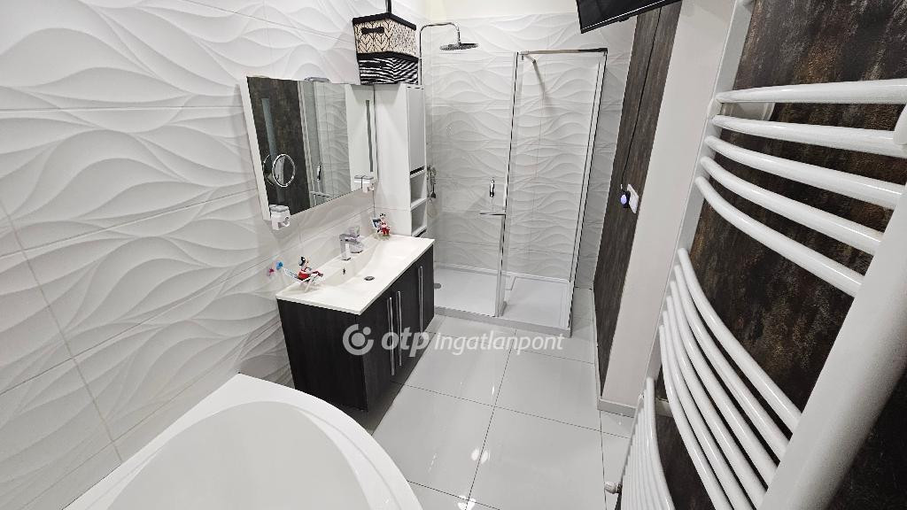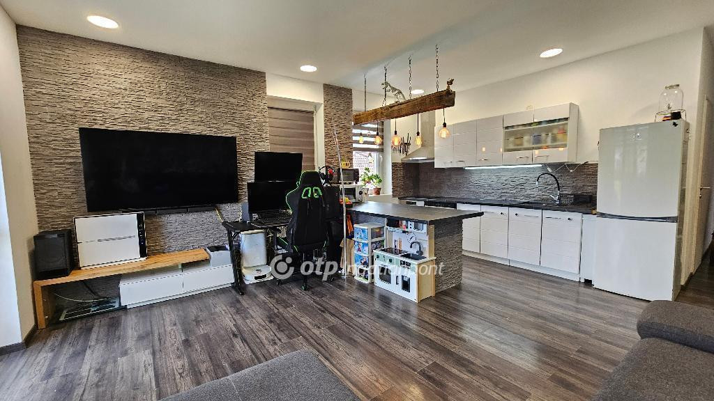 Heves megye, Almagyar városrész, 128/108 nm-es, jó állapotú, örökpanorámás (Eged-hegy), duplakomfortos, REZSIMENTES lakás eladó. A belső kétszintes ingatlan egy 2021-ben átadott, ytong falazatú (50 cm), háromlakásos sorház első emeletén helyezkedik el. A bejárat és az előszoba a földszinten található. Az emeleten amerikai konyhás nappalit, két hálószobát, fürdőszobát (sarokkáddal és zuhanyzóval), WC-t, háztartási helyiséget, közlekedőt és két erkélyt (16 nm, 7 nm) alakítottak ki, míg az idei évben beépített tetőtérben három szoba, fürdőszoba és közlekedő kapott helyet. A lakás saját használatú udvarral/kerttel rendelkezik, melyet a nappaliból nyíló erkélyről, lépcsőn közelíthetünk meg. Az ingatlan energiaellátását napelemek biztosítják, költségmentessé téve a fűtést és az összes elektromos készülék használatát is. A fűtésről elektromos kazán gondoskodik radiátorok segítségével, a komfortérzetet hűtő-fűtő klímák (3,5 kW) növelik. A meleg vízellátást villanybojler biztosítja. Háromrétegű műanyag ablakai redőnnyel szereltek. A lakáshoz, négy autó parkolását biztosító nyílt beállót alakítottak ki, melyből kettő fedett. Méretének, kialakításnak és elhelyezkedésének köszönhetően az ideális otthon lehetőségét kínálja többgyermekes család számára. Megegyezés szerint, a vételárba, kisebb lakás beszámítására van lehetőség. Amennyiben felkeltették érdeklődését a leírtak, egyeztessünk szóban egy megtekintés lehetőségéről! Ingatlanirodánk ügyvédi háttérrel, babaváró hitel, CSOK plusz, valamint kamatkedvezményes hitel ügyintézésével támogatja ügyfelei ingatlanvásárlását!