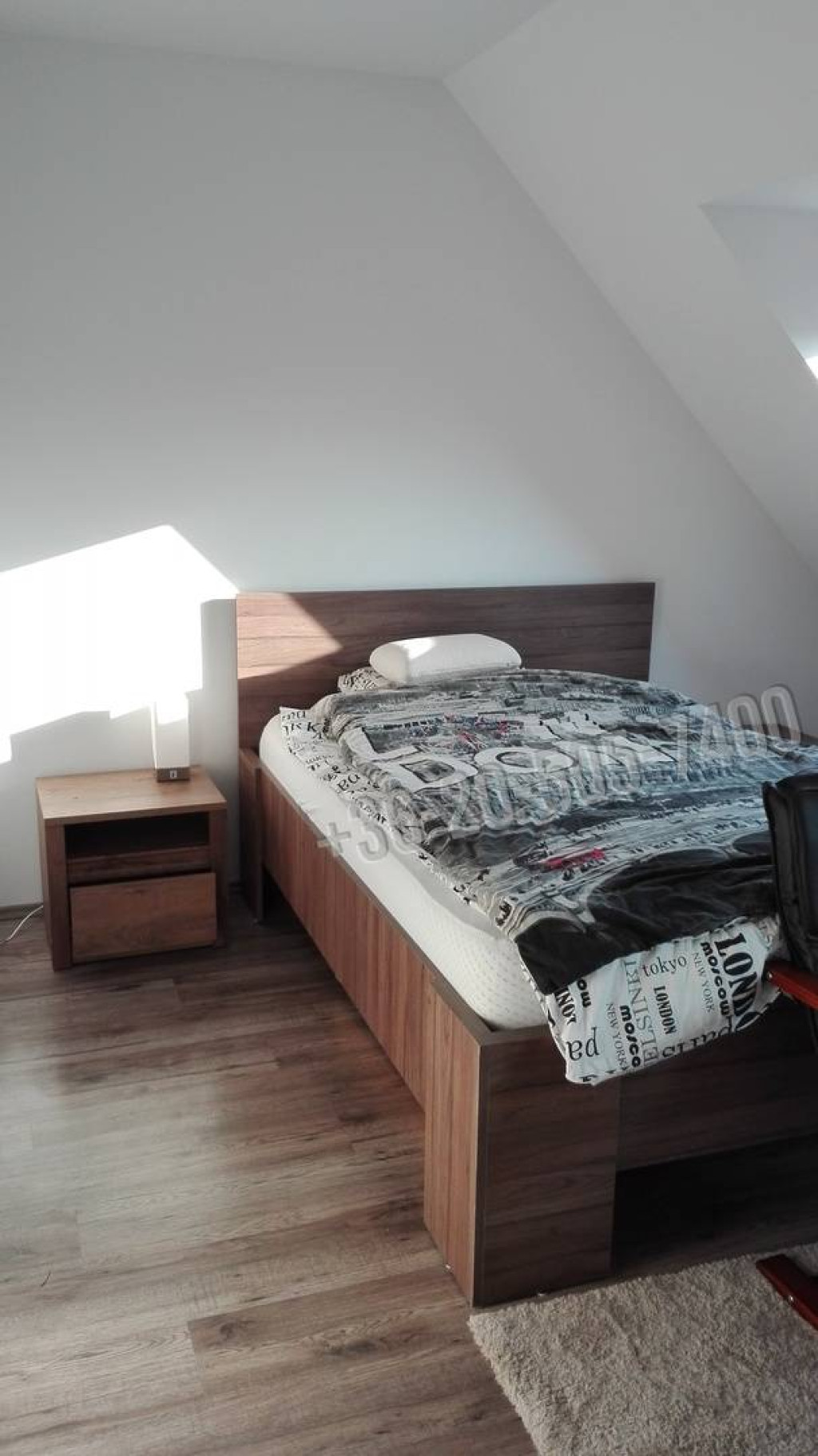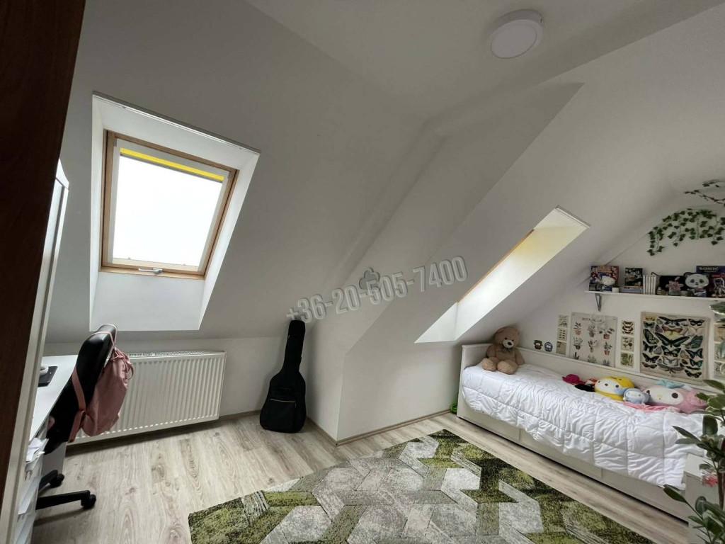 A felső szinten három kényelmes méretű hálószoba, külön konyha, egy nagyméretű, padlófűtéssel ellátott fürdőszoba sarokkáddal és WC-vel, gardrób, valamint közlekedő található. A két szint jól elkülöníti a nappali életteret és a privát zónát.