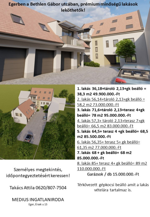 Egerben a Bethlen G. utcában 8 lakásos prémium kivitelezésű Winerberger Mesterház-ban, lakások leköthetők.