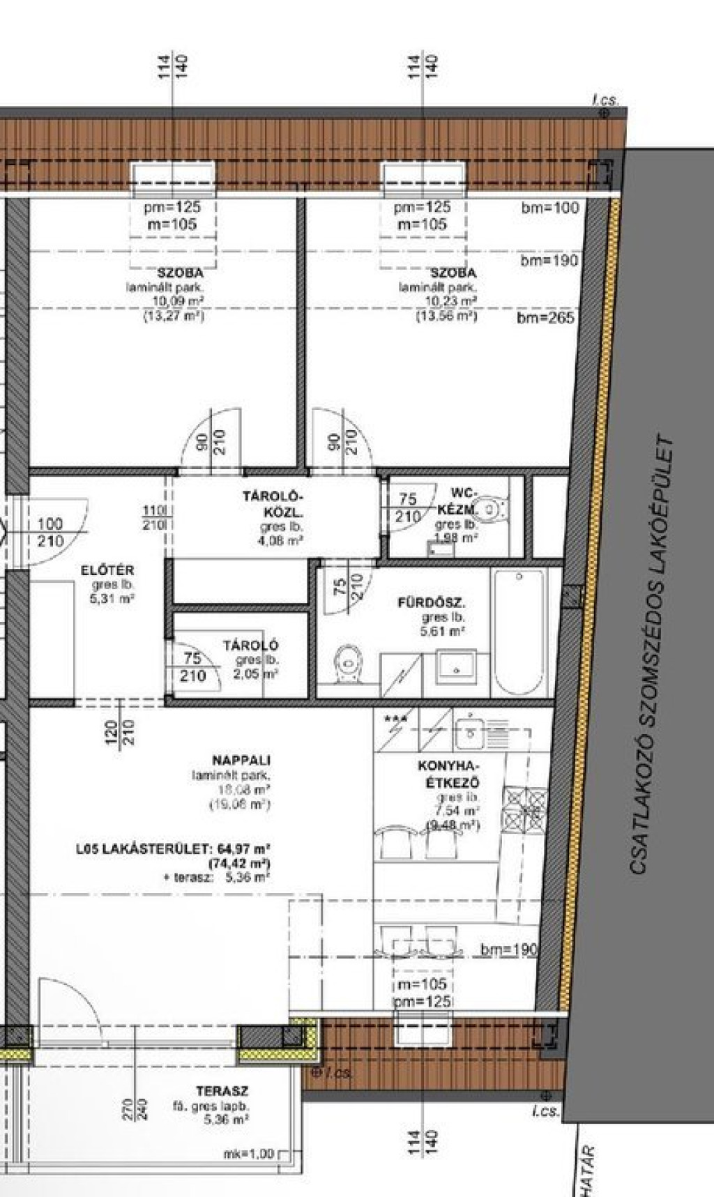 Az ingatlan elosztása rendkívül praktikus és jól átgondolt: a világos nappali harmonikus életteret biztosít, amely a tetőtéri kialakításnak köszönhetően különleges térérzetet és bőséges természetes fényt kínál. A lakás helyiségei: nappali, 2 külön nyíló szoba, étkező, konyha, fürdőszoba, külön WC és tároló, amely elrendezés kényelmes, jól élhető életteret biztosít akár családok számára is, miközben a külön WC és a tárolóhelyiség jelentősen növeli a funkcionalitást és a mindennapi komfortérzetet.