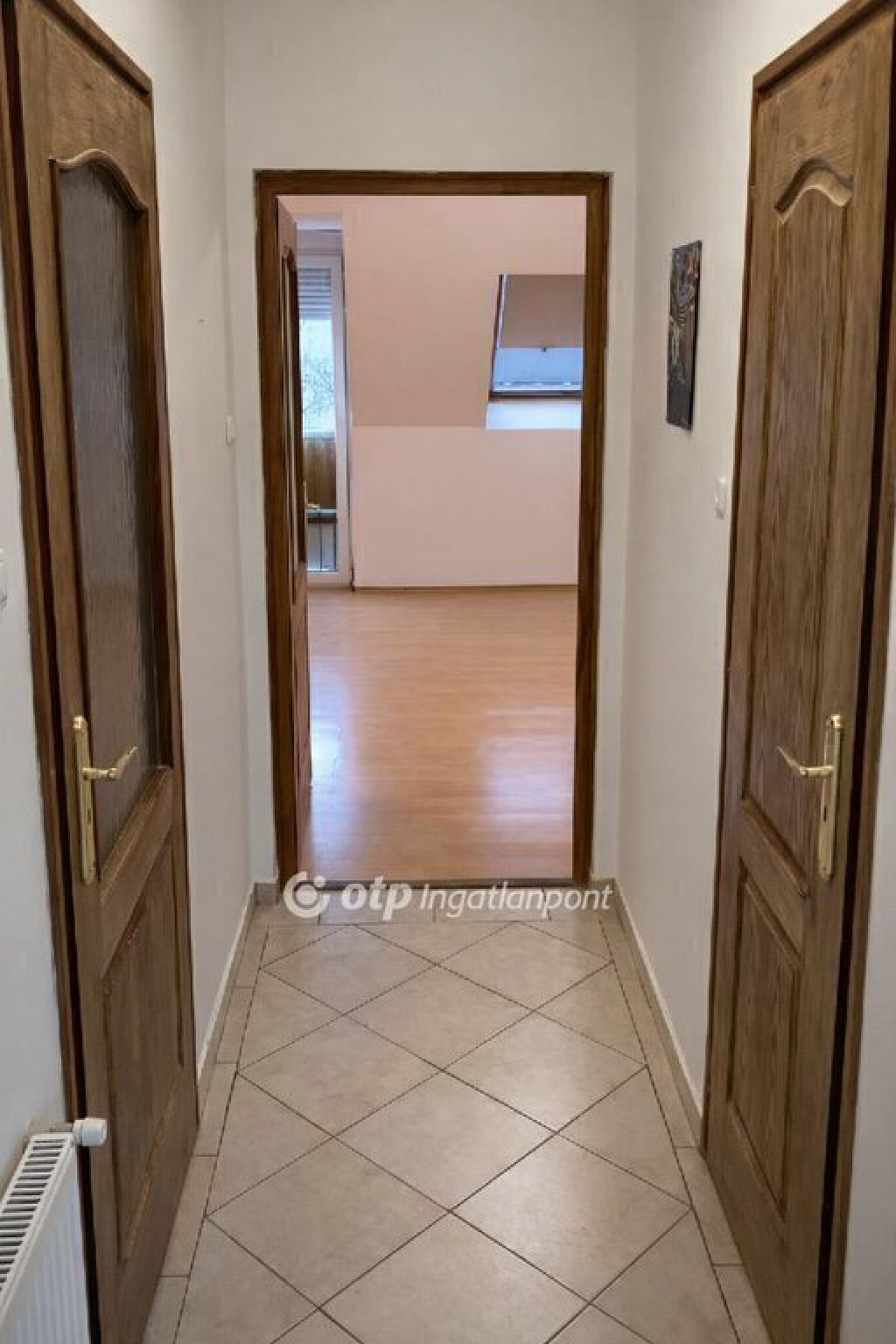 Az ingatlanba belépve egy előszoba?közlekedő?folyosó fogad bennünket, ahonnan elérhető a konyha és az étkező, valamint egy fürdőszoba, amely egy helyiségben kapott helyet a mellékhelyiséggel, továbbá egy tágas, nagyméretű szoba is, amely franciaerkélyes kialakításának köszönhetően kellemes fényviszonyokkal rendelkezik, és amelyből egy kényelmes lépcső vezet fel a tetőtérbe, ahol egy egylégterű, tetőtéri ablakkal ellátott szoba került kialakításra, így a felső szint akár hálószobaként, dolgozószobaként vagy egyéb funkcióra is kiválóan hasznosítható.
